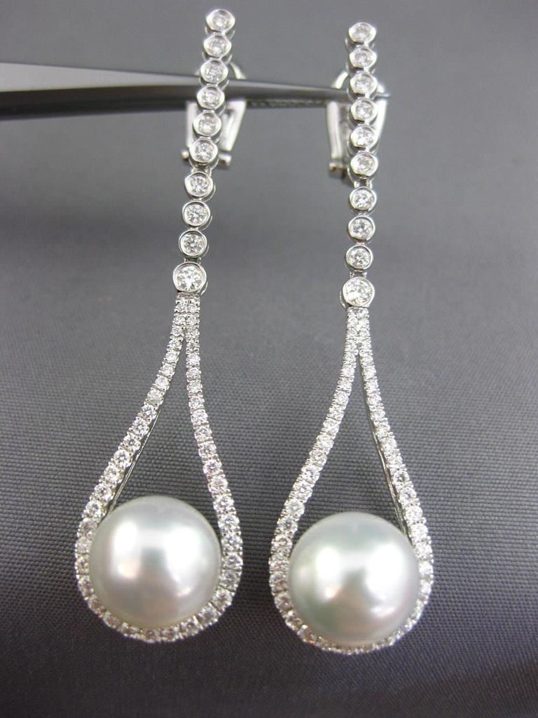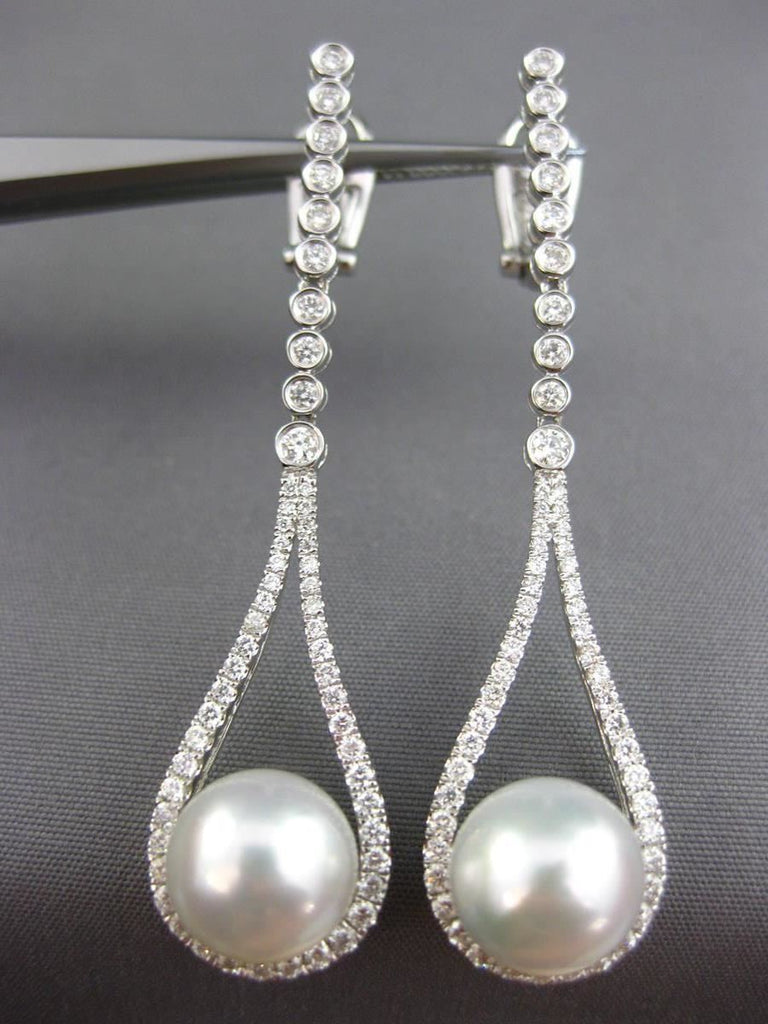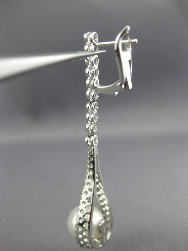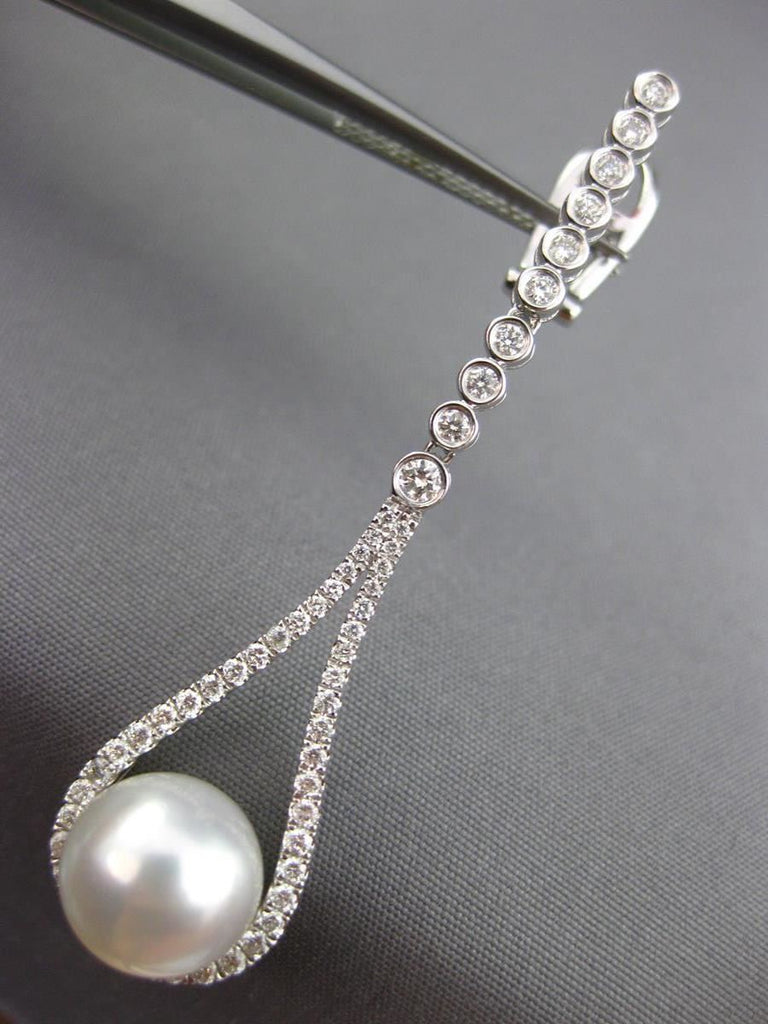 LARGE 18KT WHITE GOLD HANGING EARRINGS. 3D TEAR DROP DESIGN. DIAMONDS ARE F/G COLOR,VSSI CLARITY .92 CARATS. FEATURES AAA SOUTH SEA PEARL. MEASURES 52mm X 12mm. WRITTEN APPRAISAL AVAILABLE. COMES IN A PRESENTABLE GIFT BOX.