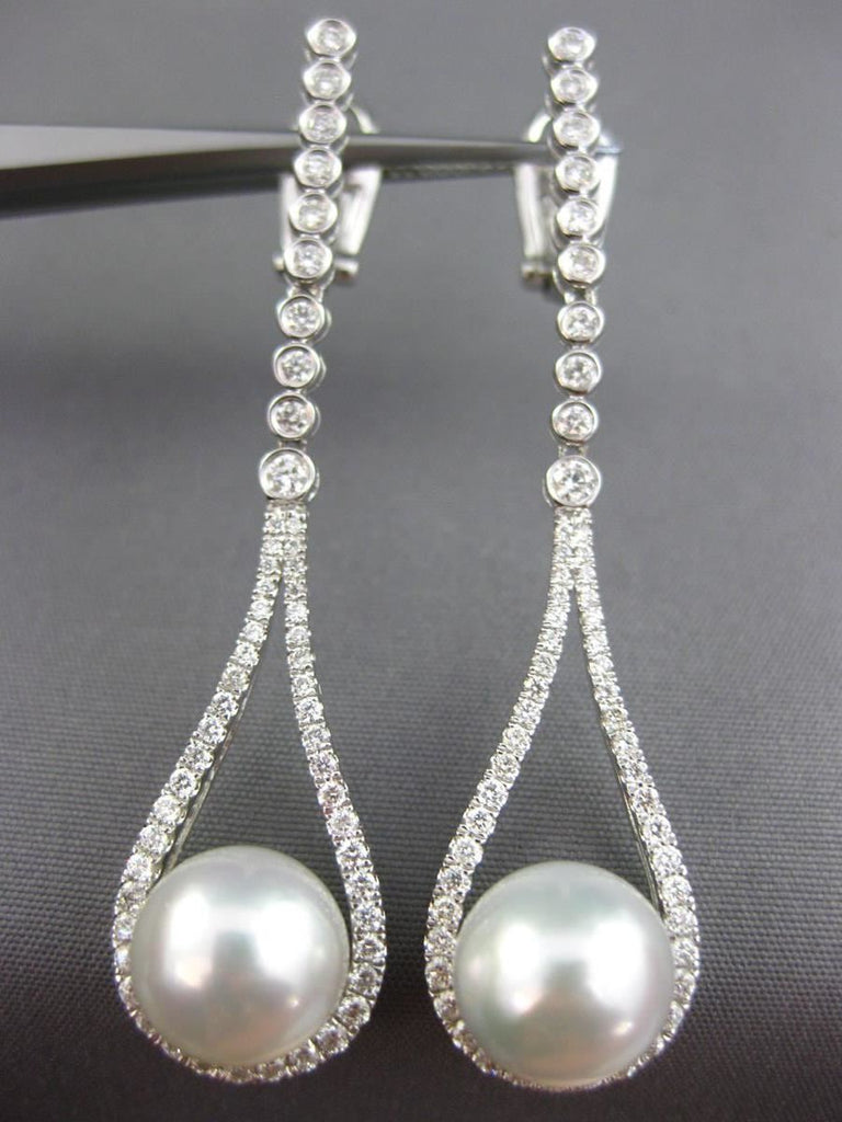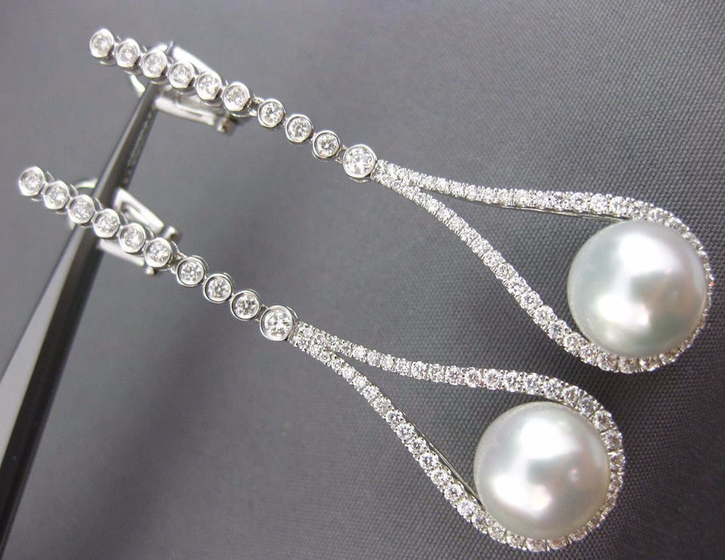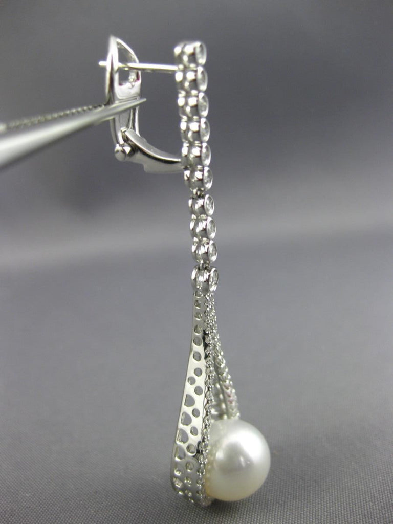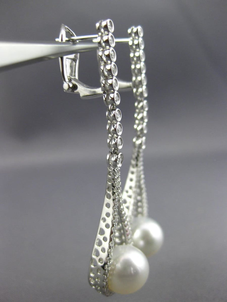 LARGE 18KT WHITE GOLD HANGING EARRINGS. 3D TEAR DROP DESIGN. DIAMONDS ARE F/G COLOR,VSSI CLARITY .92 CARATS. FEATURES AAA SOUTH SEA PEARL. MEASURES 52mm X 12mm. WRITTEN APPRAISAL AVAILABLE. COMES IN A PRESENTABLE GIFT BOX.