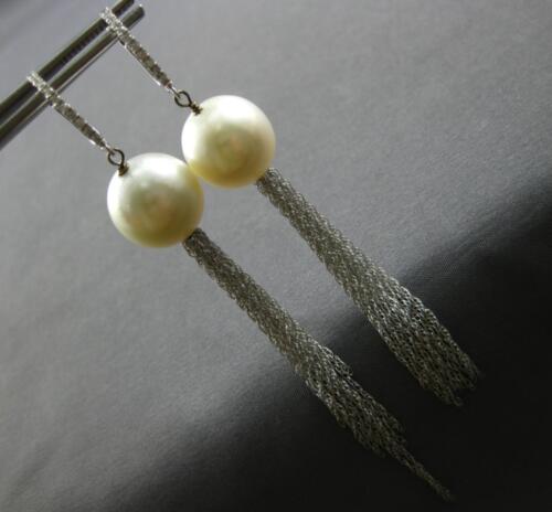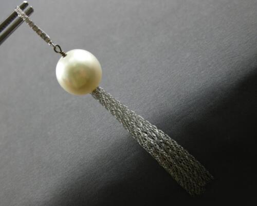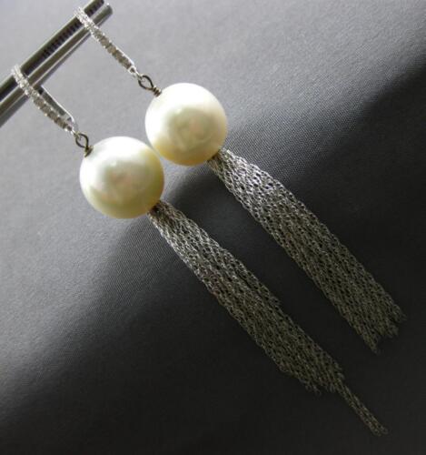 LARGE AND LONG 18KT WHITE GOLD FUN LEVERBACK HANGING EARRINGS. 3D CLASSIC MULTI CHAIN CHANDELIER DESIGN. DIAMONDS ARE F/G COLOR, VSSI CLARITY .11 CARATS. AAA SOUTH SEA PEARLS MEASURE 13mm WIDE. EARRINGS MEASURE 94mm X 13mm. WRITTEN APPRAISAL AVAILABLE. COMES IN A PRESENTABLE GIFT BOX.