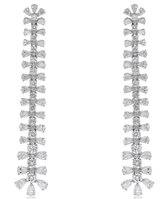 LARGE AND LONG 18KT WHITE GOLD HANGING EARRINGS. 3D TEAR DROP JOURNEYDESIGN. ROUND AND PEAR SHAPEDIAMONDS ARE F/G COLOR, VSSI CLARITY 7.12 CARATS. WRITTEN APPRAISAL AVAILABLE. COMES IN A PRESENTABLE GIFT BOX.
