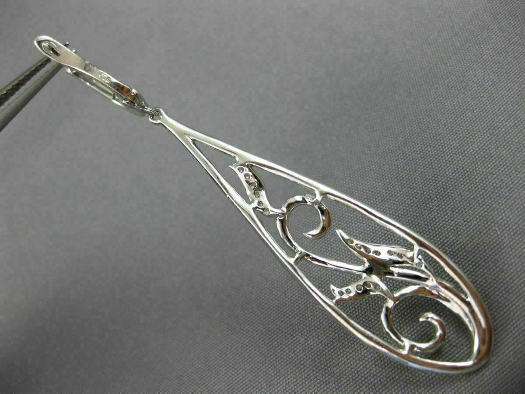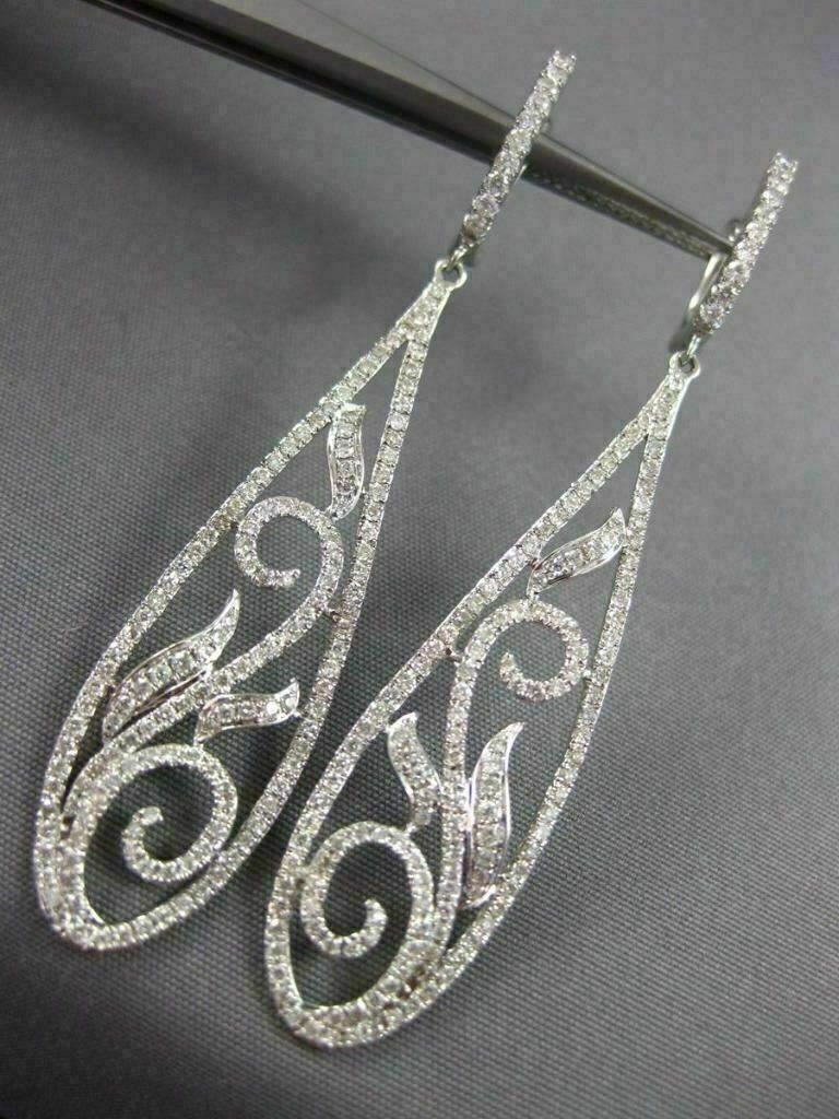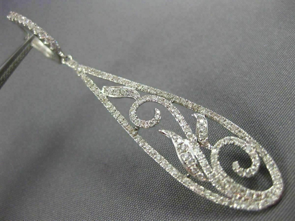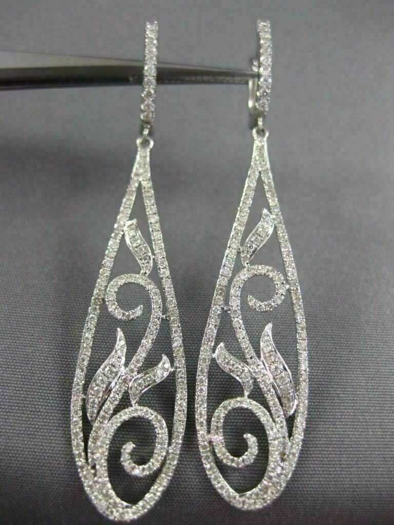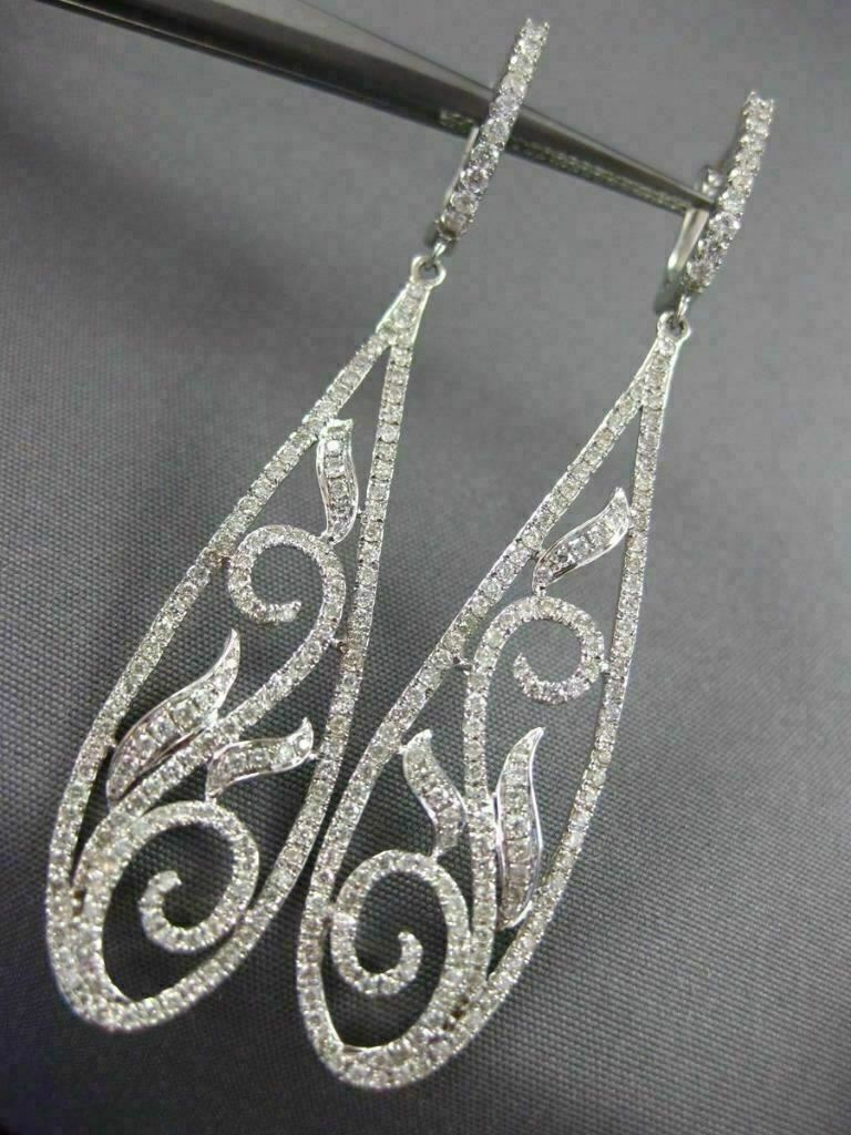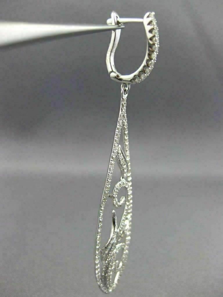 LONG 18KT WHITE GOLD LEVERBACK HANGING EARRINGS. 3D OPEN FILIGREE TEAR DROP FLOWER DESIGN. DIAMONDS ARE F/G COLOR, VSSI CLARITY 1.17 CARATS. MEASURES 57MM X 12MM. WRITTEN APPRAISAL AVAILABLE. COMES IN A PRESENTABLE GIFT BOX.