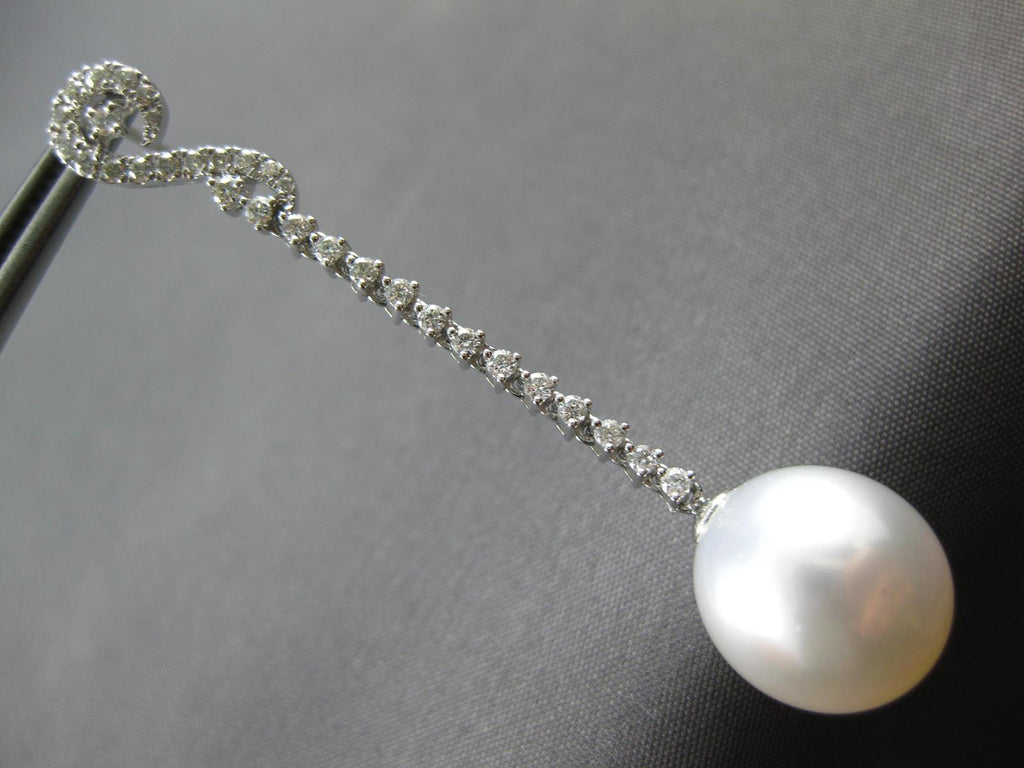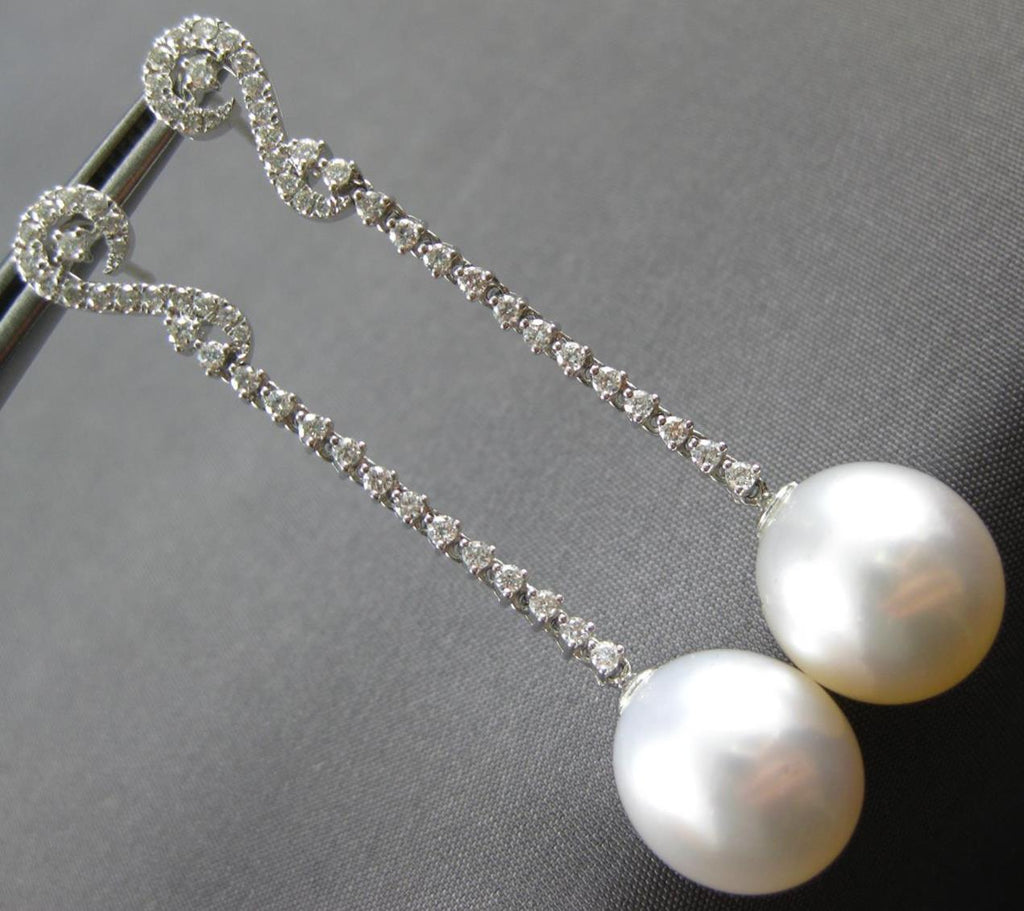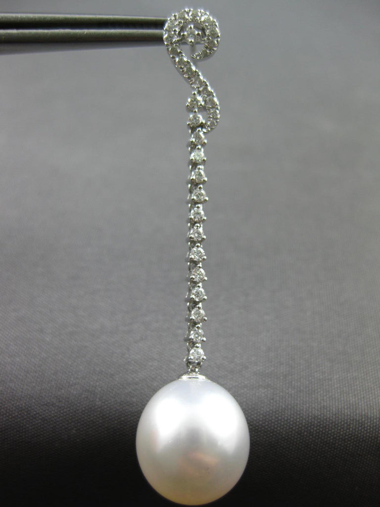 LONG 18KT WHITE GOLD HANGING EARRINGS. 3D CLASSIC SWIRL DESIGN. DIAMONDS ARE F/G COLOR, VSSI CLARITY .52 CARATS. FEATURES 11mm WIDE AAA SOUTH SEA PEARL. EARRINGS MEASURES 49mm X 11mm. WRITTEN APPRAISAL AVAILABLE. COMES IN A PRESENTABLE GIFT BOX.