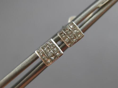 SMALL 14KT WHITE GOLD FUN STUD EARRINGS. 3D CLASSIC INVISIBLE SQUARE DESIGN. PRINCESS CUT DIAMONDS ARE F/G COLOR, VVS-VS CLARITY .25 CARATS. MEASURES 4.2mm WIDE. WRITTEN APPRAISAL AVAILABLE. COMES IN A PRESENTABLE GIFT BOX.