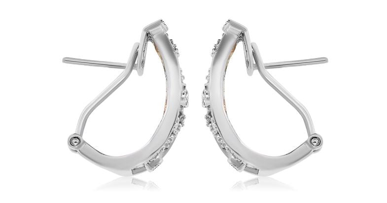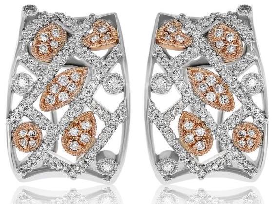 WIDE 14KT WHITE AND ROSEGOLD FUN HUGGIE HANGING EARRINGS. 3D MULTI SHAPE CRISS CROSS DESIGN. DIAMONDS ARE F/G COLOR, VSSI CLARITY 1.05CARATS. WRITTEN APPRAISAL AVAILABLE. COMES IN A PRESENTABLE GIFT BOX.