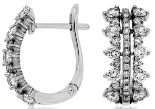 WIDE 14KT WHITE GOLD LEVERBACK HANGING EARRINGS. 3D THREE ROW CLASSIC FLORAL DESIGN. DIAMONDS ARE F/G COLOR, VSSI CLARITY 1.08 CARATS. WRITTEN APPRAISAL AVAILABLE. COMES IN A PRESENTABLE GIFT BOX.