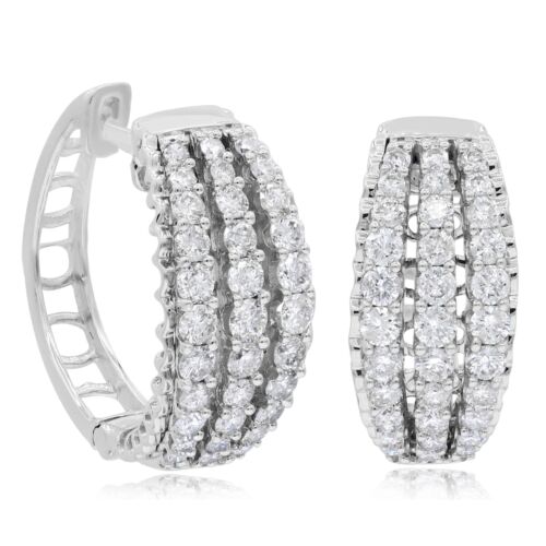 14KT WHITE GOLD HUGGIE HOOP HANGING EARRINGS. 3D CLASSIC THREE ROW DESIGN. ROUND DIAMONDS ARE F/G COLOR, VSSI CLARITY 1.08 CARATS.