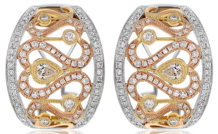 WIDE18KT WHITE, YELLOW, AND ROSEGOLD LOVE CLIP ONHANGING EARRINGS. 3D OPEN FILIGREE SIDEWAYHEARTDESIGN.DIAMONDS ARE F/G COLOR, VSSI CLARITY 1.22CARATS. WRITTEN APPRAISAL AVAILABLE. COMES IN A PRESENTABLE GIFT BOX.
