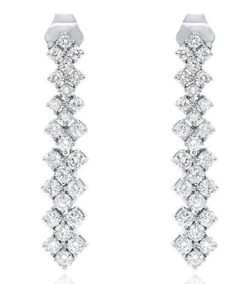 WIDE 18KT WHITE GOLD FUNHANGINGEARRINGS. 3D CLASSIC THREE ROW ROUND FLEXIBLEDESIGN. DIAMONDS ARE F/G COLOR, VSSI CLARITY 1.37CARATS.WRITTEN APPRAISAL AVAILABLE. COMES IN A PRESENTABLE GIFT BOX.