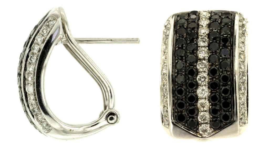 WIDE 14KT WHITE GOLD CLIP ON EARRINGS. 3D MULTI ROW DESIGN. WHITE DIAMONDS ARE F/G COLOR, VSSI CLARITY .58 CARATS. BLACK DIAMONDS ARE .95 CARATS. WRITTEN APPRAISAL AVAILABLE. COMES IN A PRESENTABLE GIFT BOX.