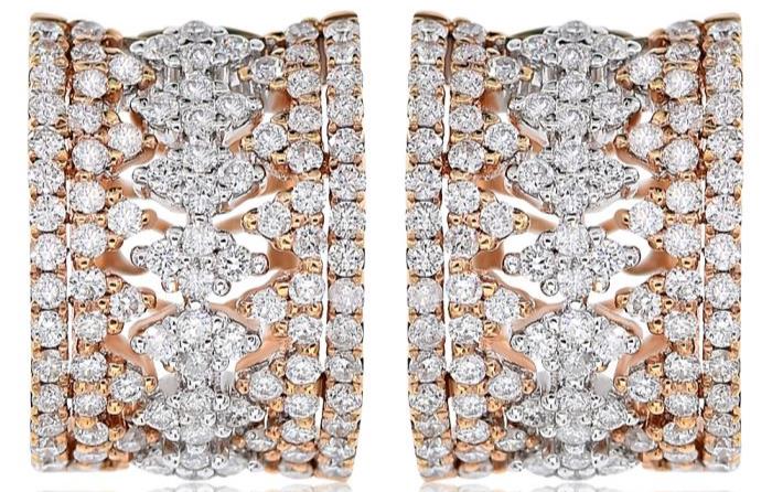 WIDE 18KT ROSE GOLD CLIP ON HANGING EARRINGS. 3D MULTI FLOWER MULTI ROWDESIGN. DIAMONDS ARE F/G COLOR, VSSI CLARITY 1.60 CARATS. WRITTEN APPRAISAL AVAILABLE. COMES IN A PRESENTABLE GIFT BOX.