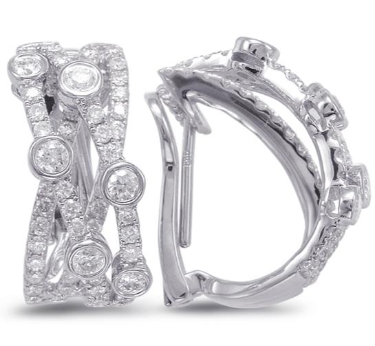 WIDE 14KT WHITE GOLD CLIP ON HANGING EARRINGS. 3D MULTI ROW CRISS CROSS X DESIGN. DIAMONDS ARE F/G COLOR, VSSI CLARITY 1.49 CARATS. MEASURES 9mm WIDE. WRITTEN APPRAISAL AVAILABLE. COMES IN A PRESENTABLE GIFT BOX.