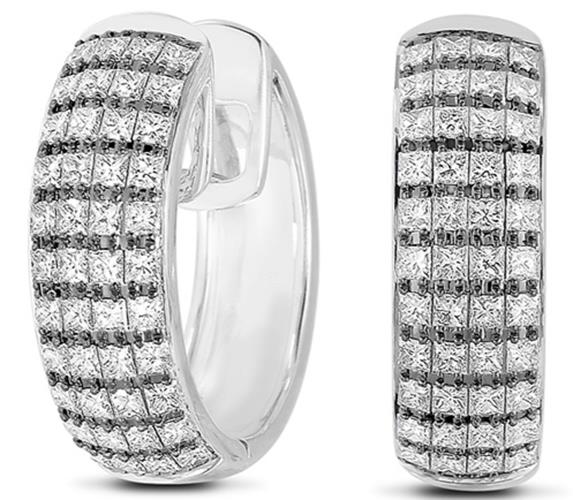 WIDE 14KT WHITE AND BLACK GOLD HUGGIE HOOP EARRINGS. 3D FOUR ROW CLASSIC DESIGN. PRINCESS CUT DIAMONDS ARE F/G COLOR, VSSI CLARITY 1.57 CARATS. WRITTEN APPRAISAL AVAILABLE. COMES IN A PRESENTABLE GIFT BOX.