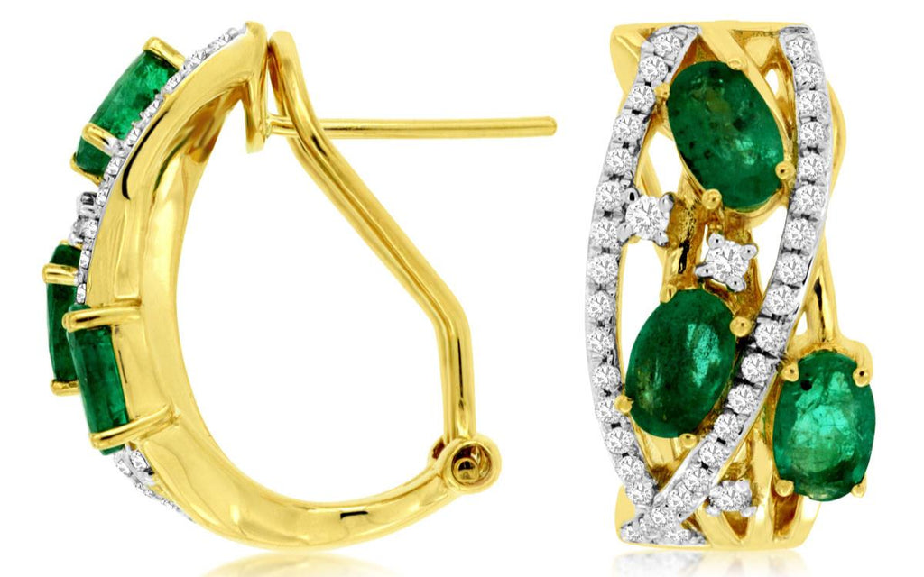 WIDE 1.58CT DIAMOND & AAA EMERALD 14KT YELLOW GOLD OVAL & ROUND HANGING EARRINGS