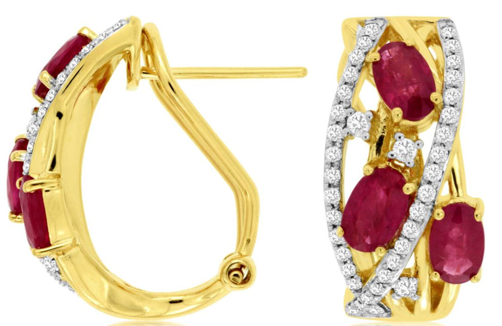 WIDE 14KT YELLOW GOLD CLIP ON HANGING EARRINGS. 3D CRISS CROSS DESIGN. ROUND DIAMONDS ARE F/G COLOR, VSSI CLARITY .33 CARATS. AAA OVAL RUBIES ARE 1.75 CARATS. WRITTEN APPRAISAL AVAILABLE. COMES IN A PRESENTABLE GIFT BOX.