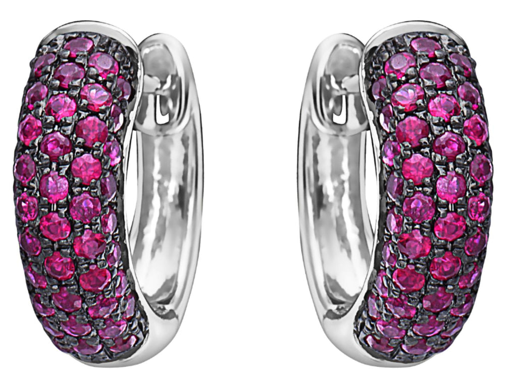 WIDE 18KT WHITE AND BLACK GOLD HUGGIE EARRINGS. 3D CLASSIC MULTI ROW DESIGN. AAA RUBIES ARE 2.0 CARATS. WRITTEN APPRAISAL AVAILABLE. COMES IN A PRESENTABLE GIFT BOX.