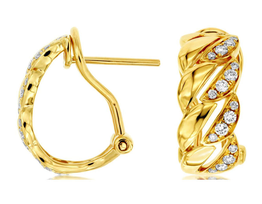 WIDE 14KT YELLOW GOLD CLIP ON HANGING EARRINGS. 3D MULTI LEAF CRISS CROSS UMBRELLA DESIGN. DIAMONDS ARE F/G COLOR, VSSI CLARITY .25 CARATS. WRITTEN APPRAISAL AVAILABLE. COMES IN A PRESENTABLE GIFT BOX.