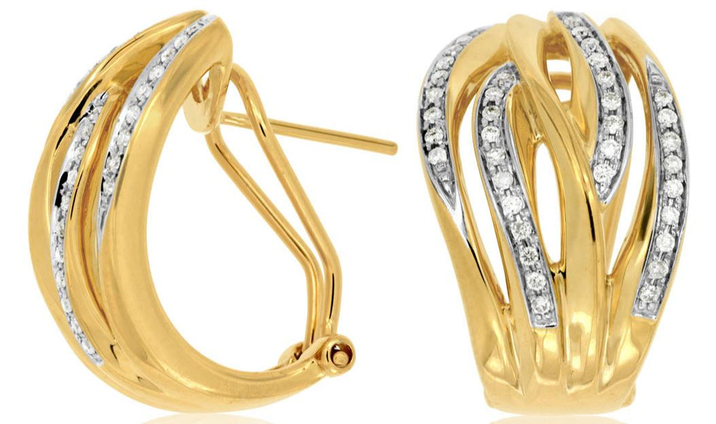 WIDE 14KT YELLOW GOLD CLIP ON HANGING EARRINGS. 3D MULTI ROW MULTI WAVE DESIGN. DIAMONDS ARE F/G COLOR, VSSI CLARITY .32 CARATS. WRITTEN APPRAISAL AVAILABLE. COMES IN A PRESENTABLE GIFT BOX.
