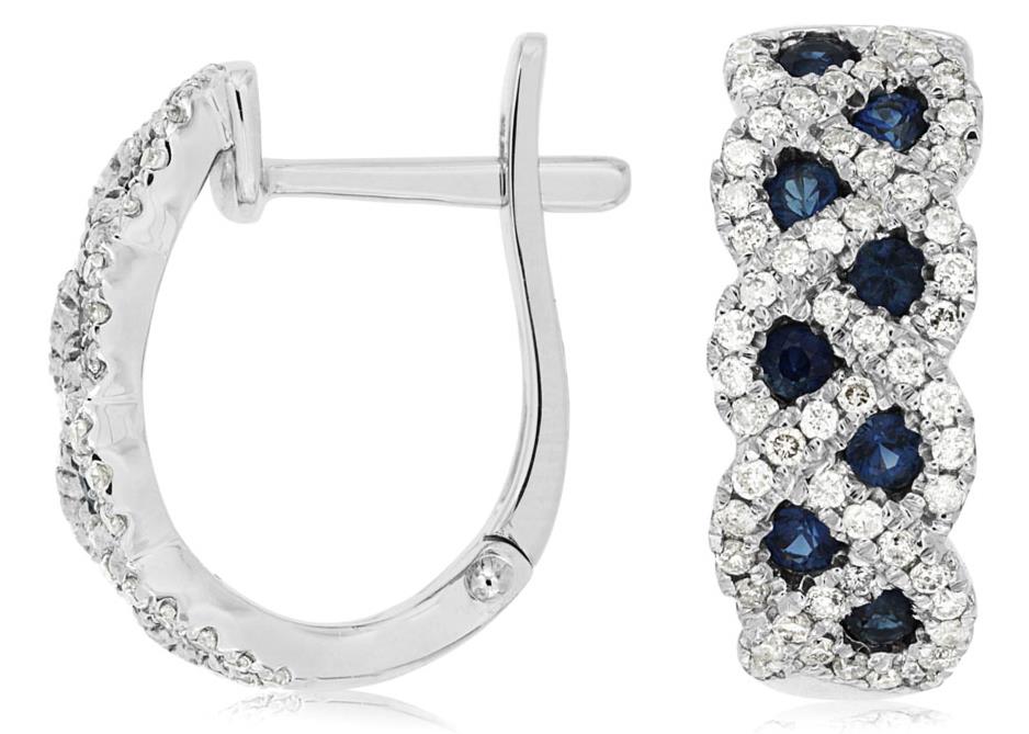 WIDE 14KT WHITE GOLD LOVE LEVERBACK HANGING EARRINGS. 3D MULTI ROW INFINITY DESIGN. DIAMONDS ARE F/G COLOR, VSSI CLARITY .42 CARATS. AAA SAPPHIRES ARE .52 CARATS. CAN BE SIZED BY OUR MASTER JEWELER UPON REQUEST. WRITTEN APPRAISAL AVAILABLE. COMES IN A PRESENTABLE GIFT BOX.