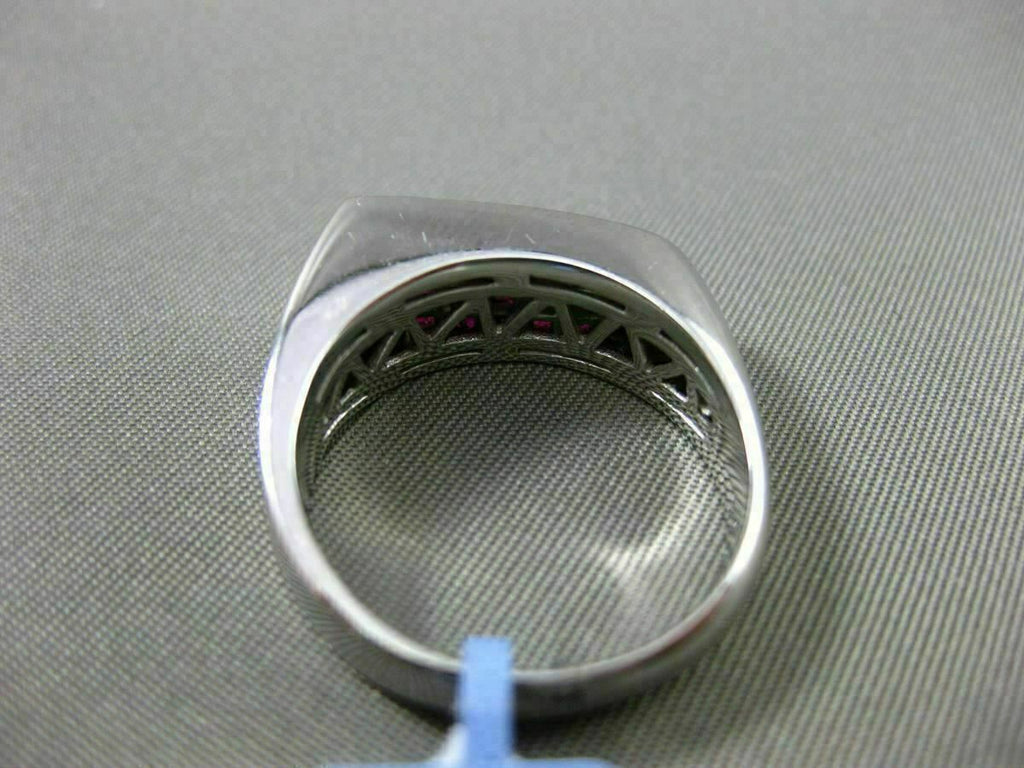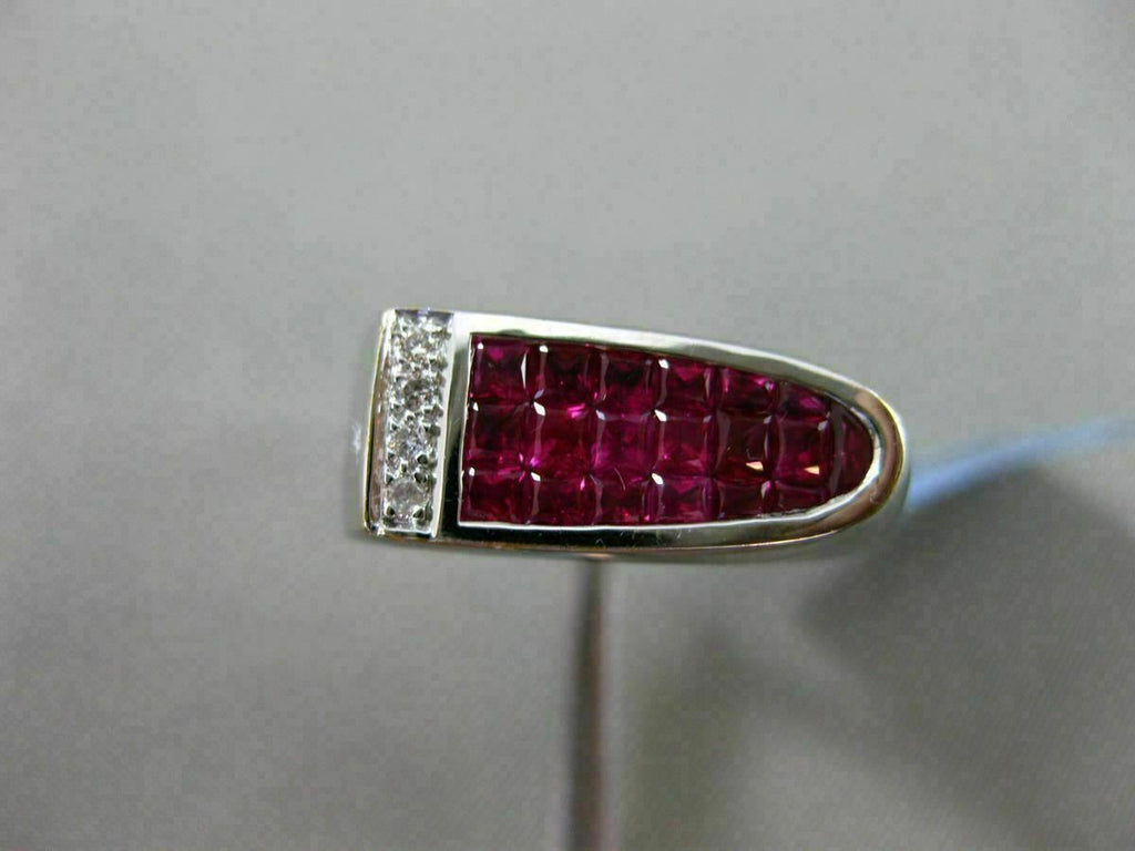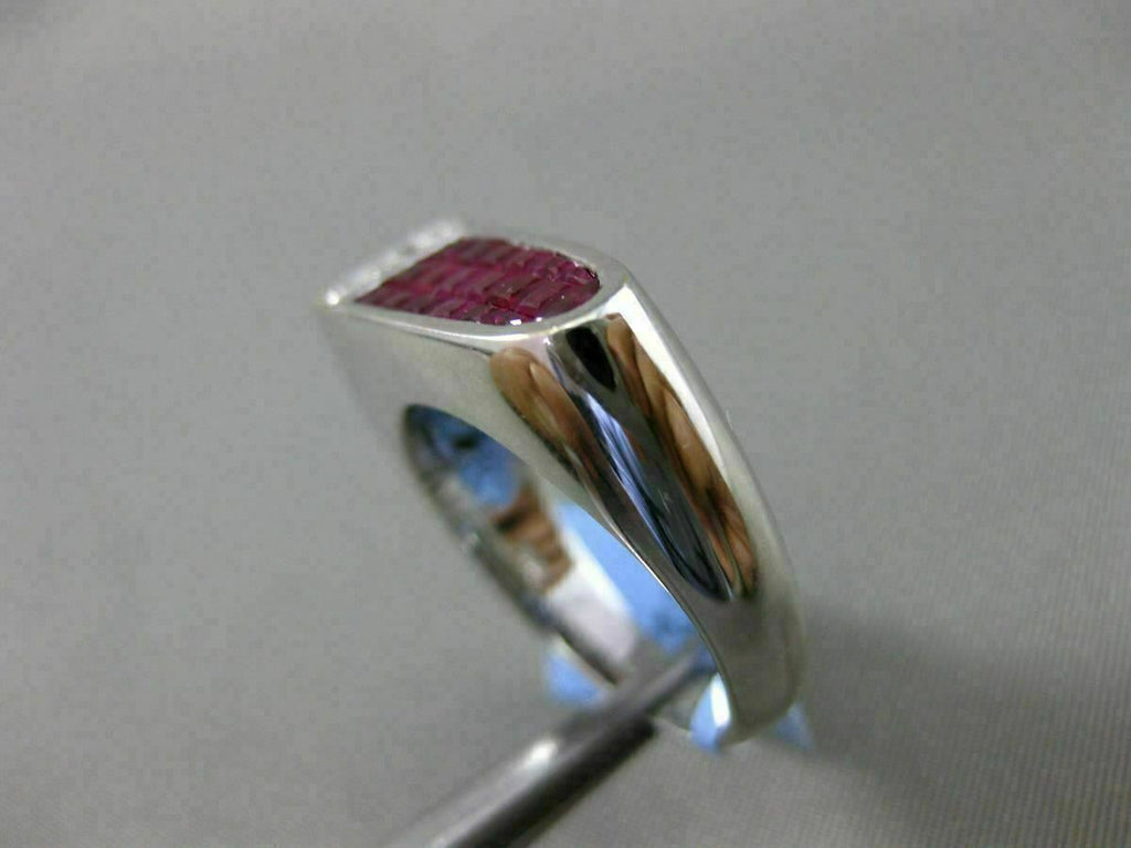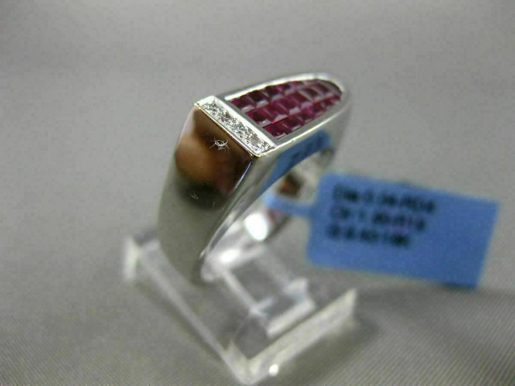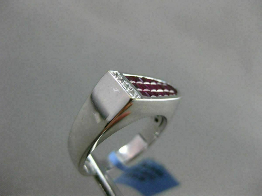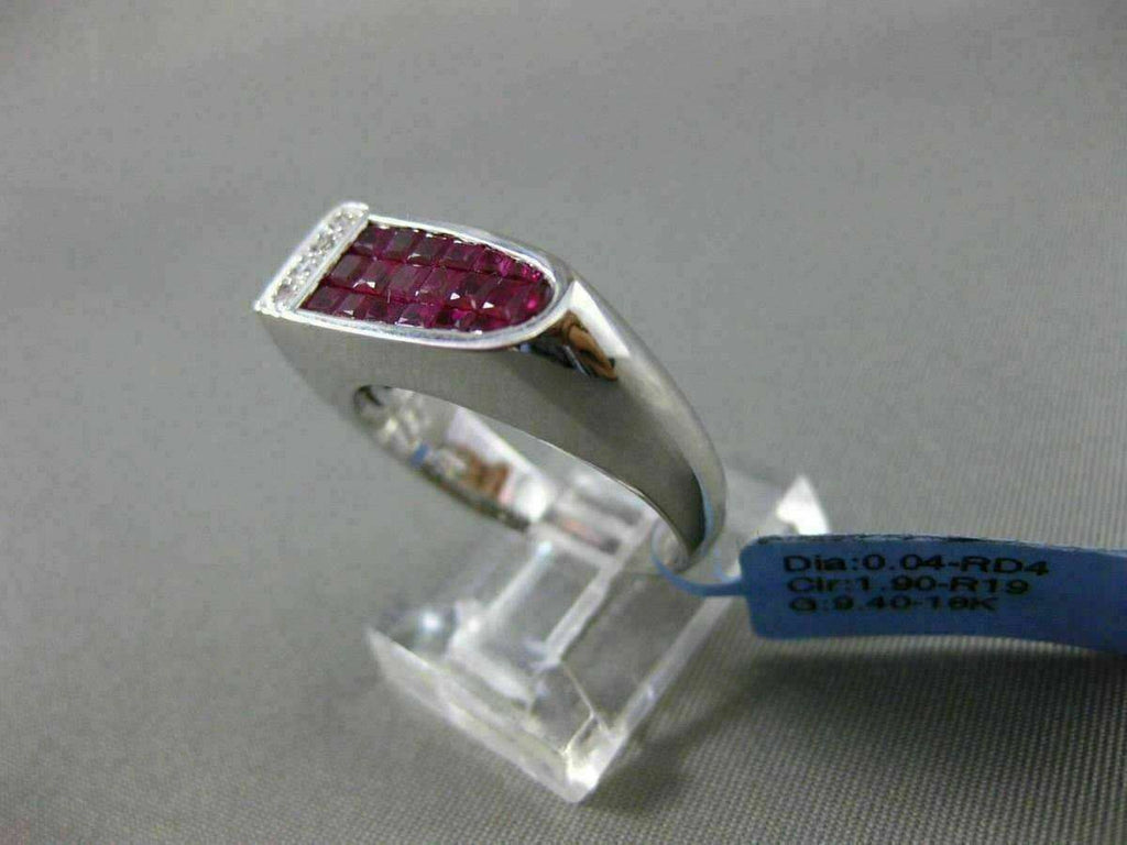 ESTATE 18KT WHITE GOLD MENS RING. 3D DESIGN. DIAMONDS ARE F/G COLOR, VS CLARITY .04 CARATS. PRINCESS CUT AAA EXTRA FACET RUBIES ARE 1.90 CARATS. MEASURES 7mm WIDE. RING IS SIZE 7.25. CAN BE SIZED BY OUR MASTER JEWELER. WRITTEN APPRAISAL AVAILABLE. COMES IN A PRESENTABLE GIFT BOX.