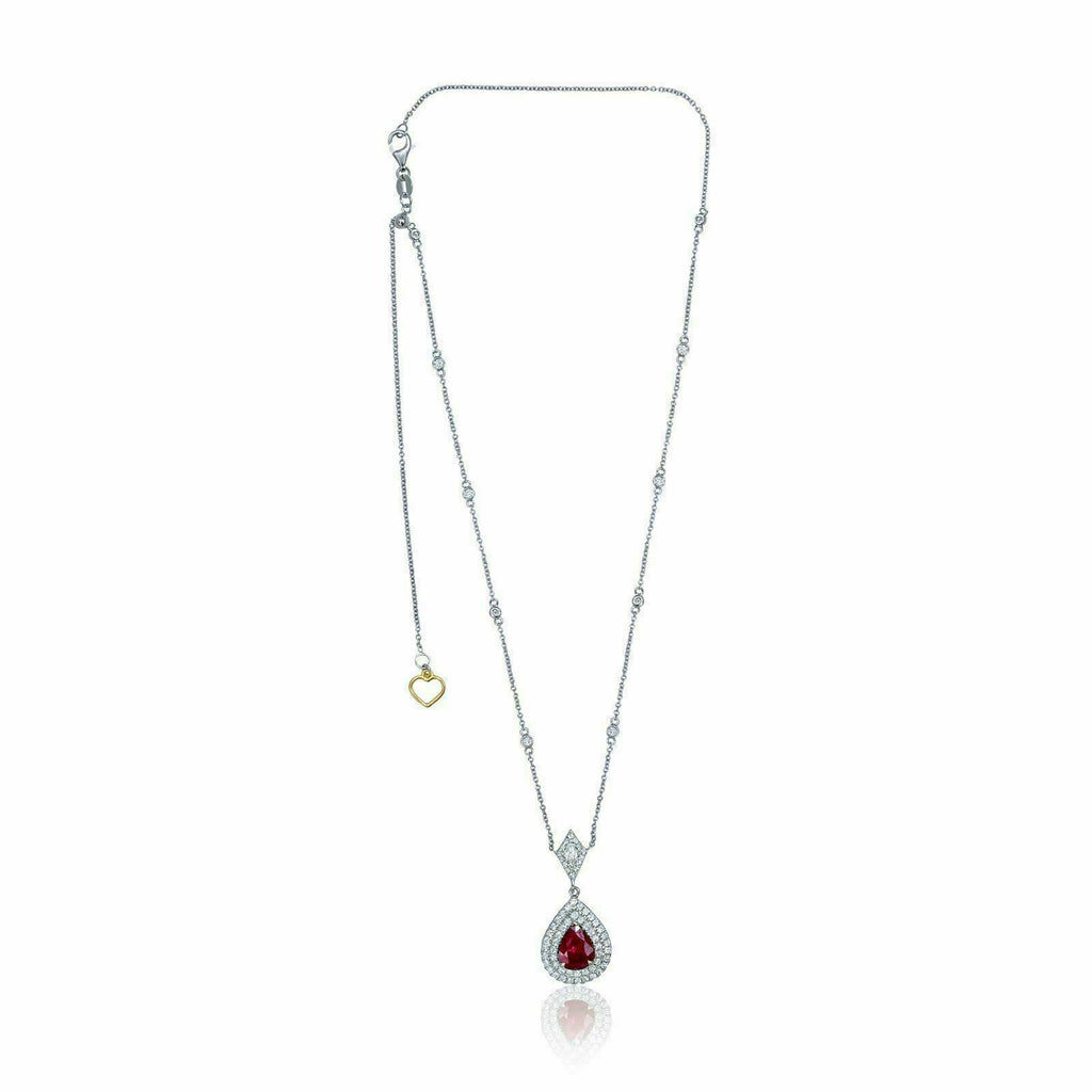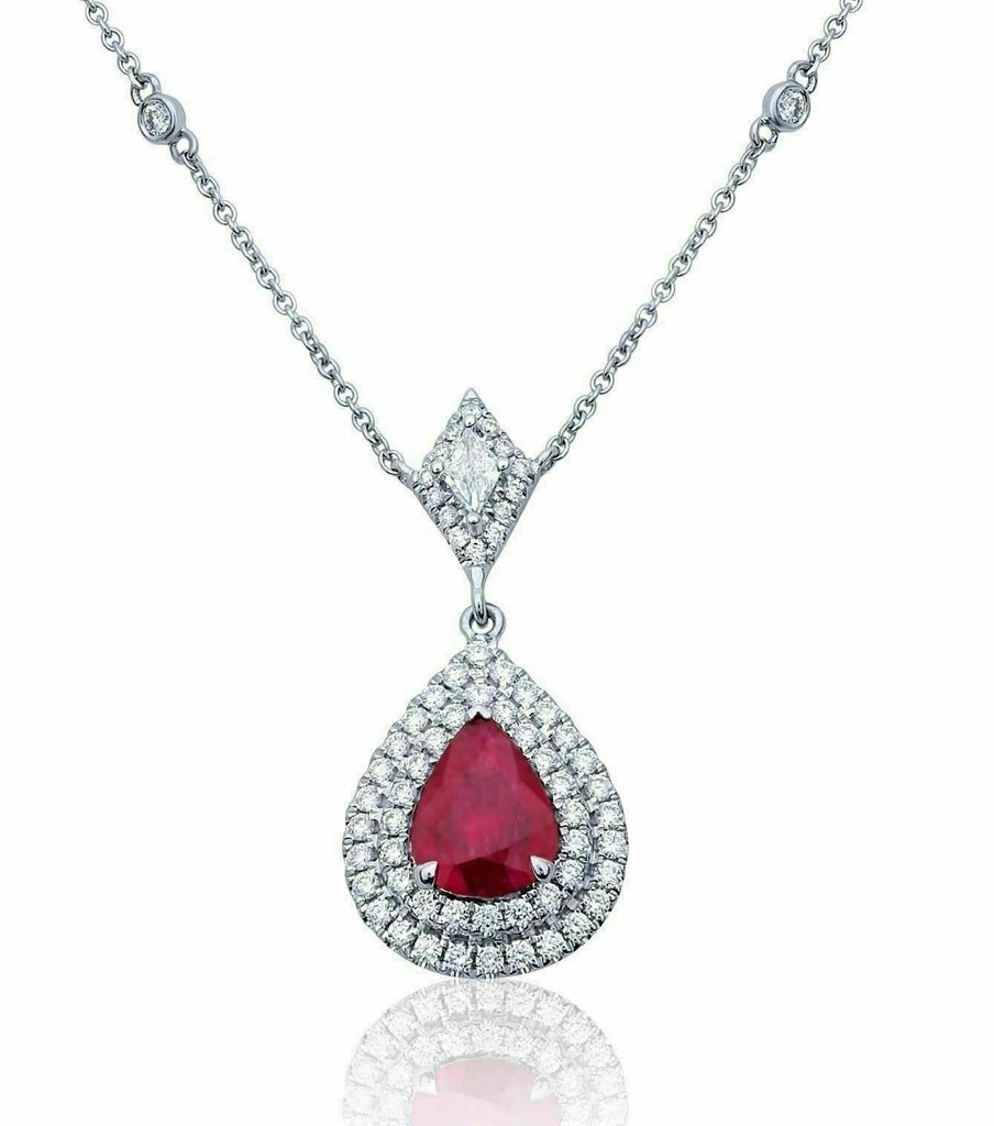 ESTATE 2.10CT DIAMOND & AAA RUBY 18KT 2 TONE GOLD TEAR DROP DOUBLE HALO NECKLACE