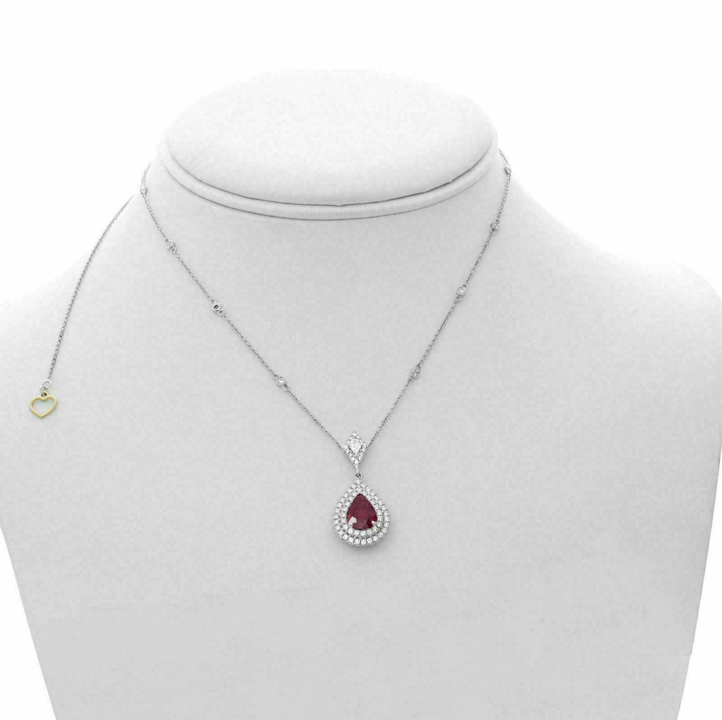 ESTATE 18KT WHITE AND YELLOW¬€ GOLD LOVE NECKLACE. 3D TEAR DROP DOUBLE HALO BY THE YARD¬€ DESIGN. DIAMONDS ARE F/G COLOR, VSSI CLARITY .79 CARATS. AAA RUBIES ARE 1.31 CARATS. MEASURES 29mm WIDE. 17" INCHES LONG. WRITTEN APPRAISAL AVAILABLE. COMES IN A PRESENTABLE GIFT BOX.