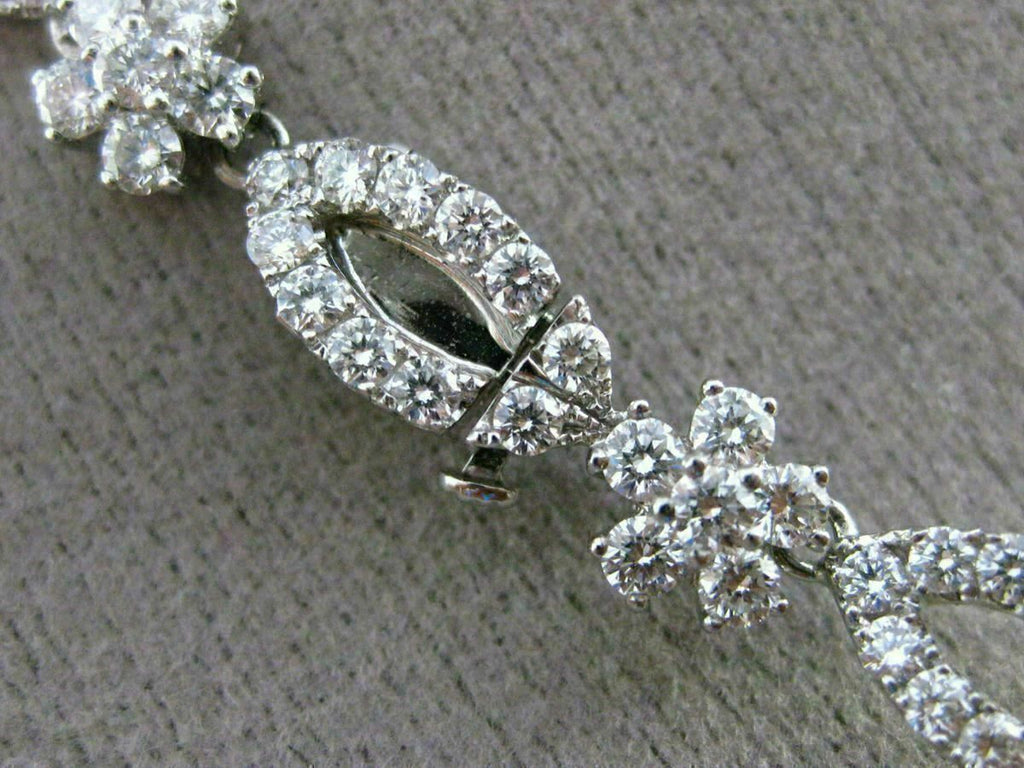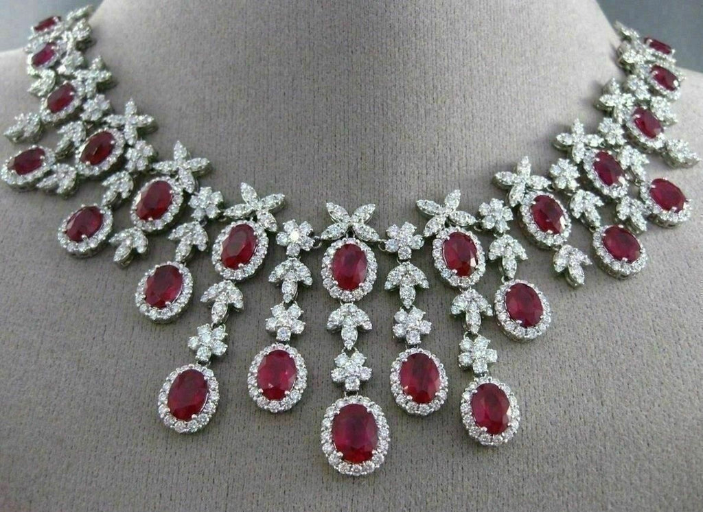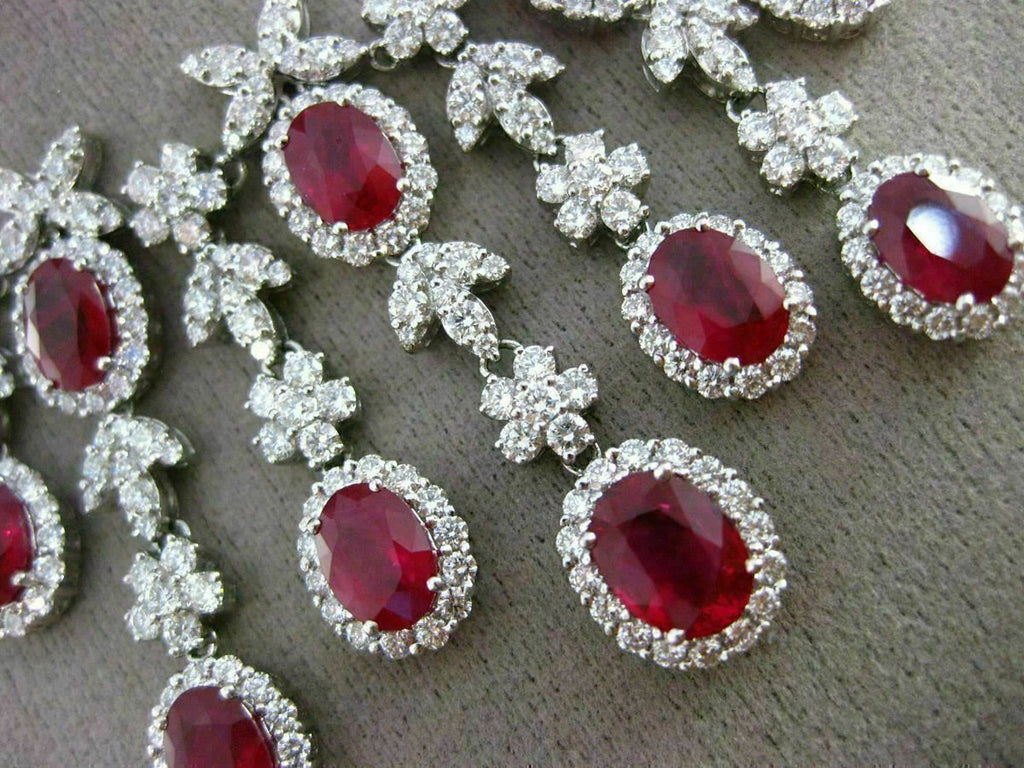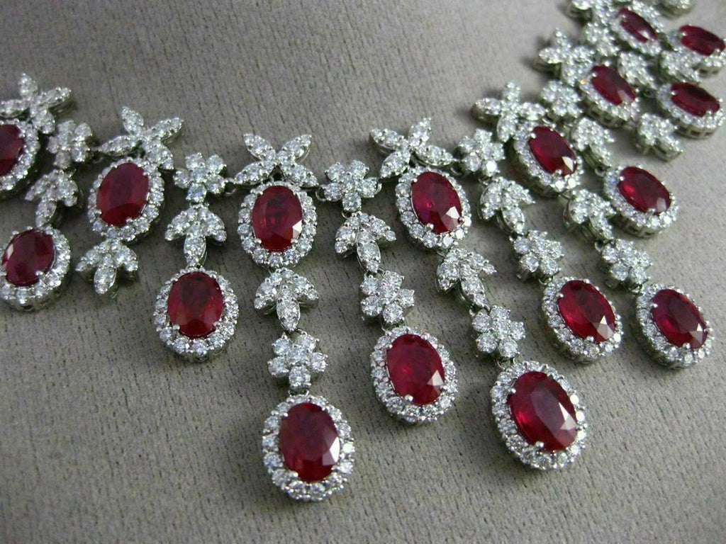 ESTATE EXTRA LARGE CERTIFIED 18KT WHITE GOLD COCKTAIL NECKLACE. 3D HANDCRAFTED CHANDELIER FLOWER FLORAL LEAF, SIMPLY MAGNIFICENT DESIGN. DIAMONDS ARE E/F COLOR, VVS/VS CLARITY 17.98 CARATS. AAA EXTRA FACET RUBIES ARE 25.80 CARATS. DROP IS 40mm X 10mm. NECKLACE MEASURES 6mm WIDE. 17" INCHES LONG. CERTIFICATE, AND WRITTEN APPRAISAL AVAILABLE. MATCHING COCKTAIL HANGING EARRINGS ARE AVAILABLE. COMES IN A PRESENTABLE GIFT BOX.