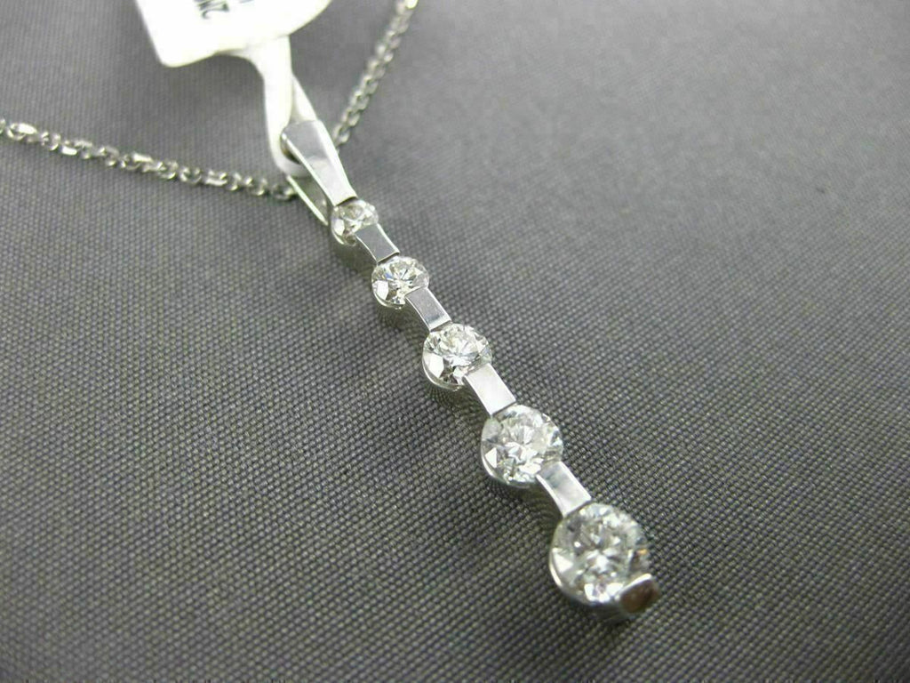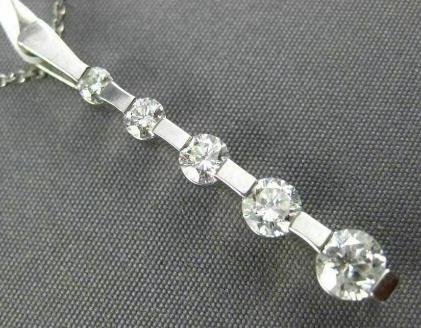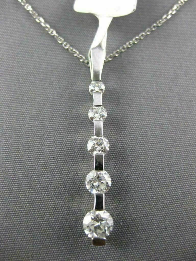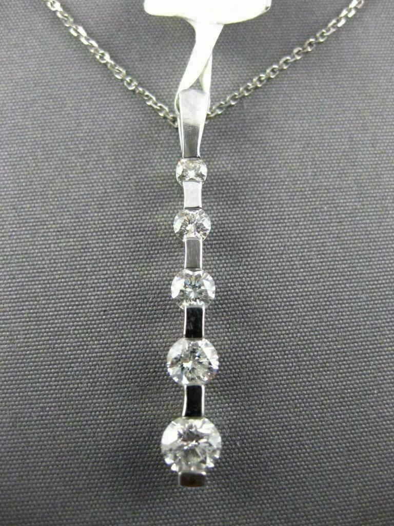 ESTATE 14KT WHITE GOLD FLOATING PENDANT. 3D FIVE STONE GRADUATING ETOILE JOURNEY DESIGN. DIAMONDS ARE F/G COLOR, VSSI CLARITY 1.40 CARATS. MEASURES 32mm X 2mm. COMES ON A 14KT GOLD DIAMOND CUT 16" INCH CHAIN. WRITTEN APPRAISAL AVAILABLE. COMES IN A PRESENTABLE GIFT BOX.