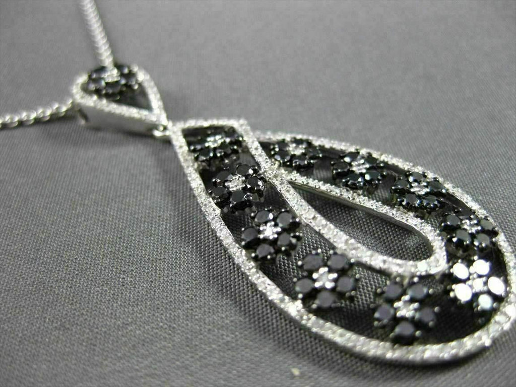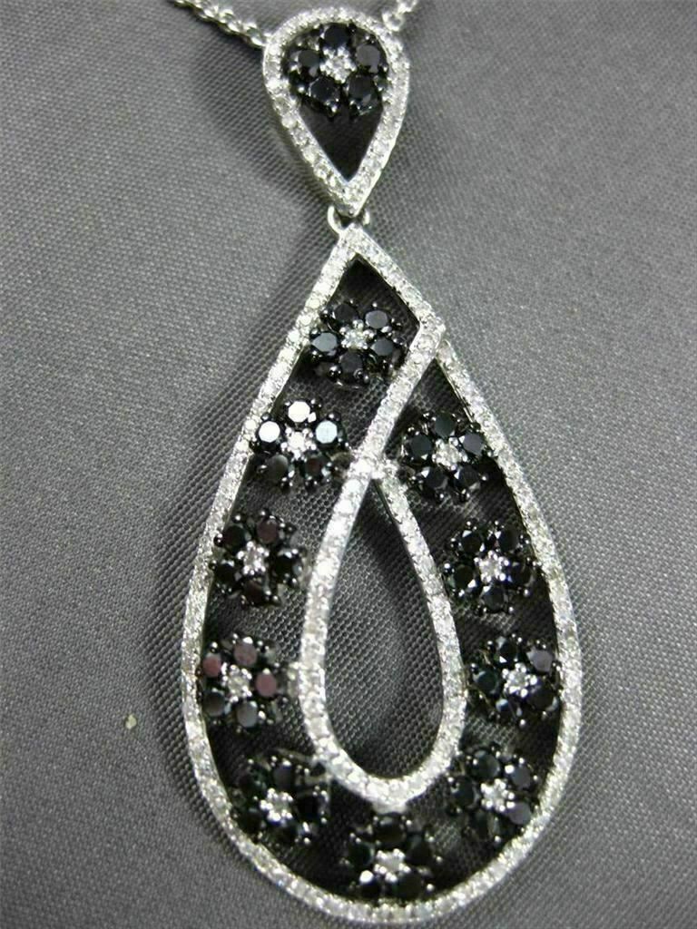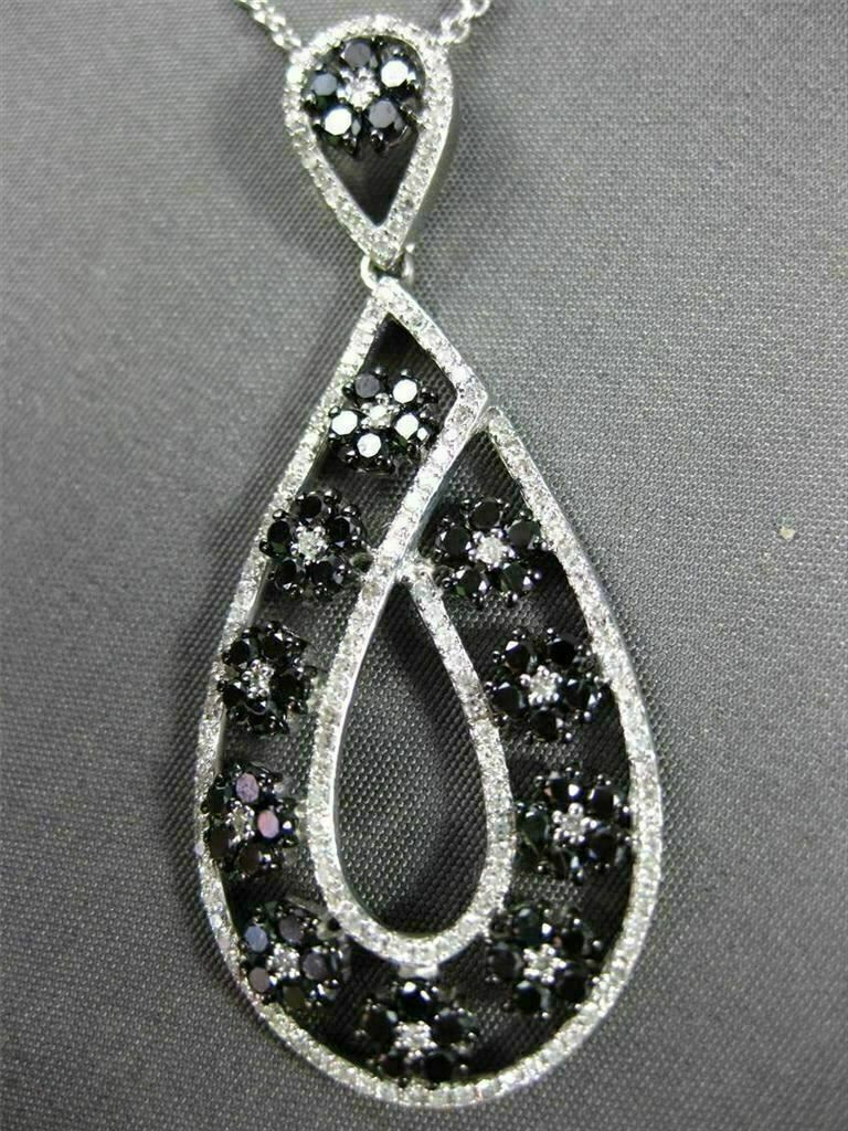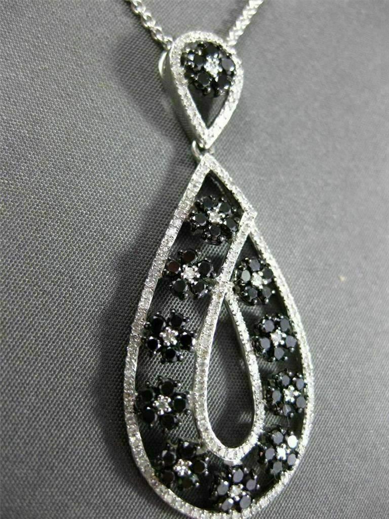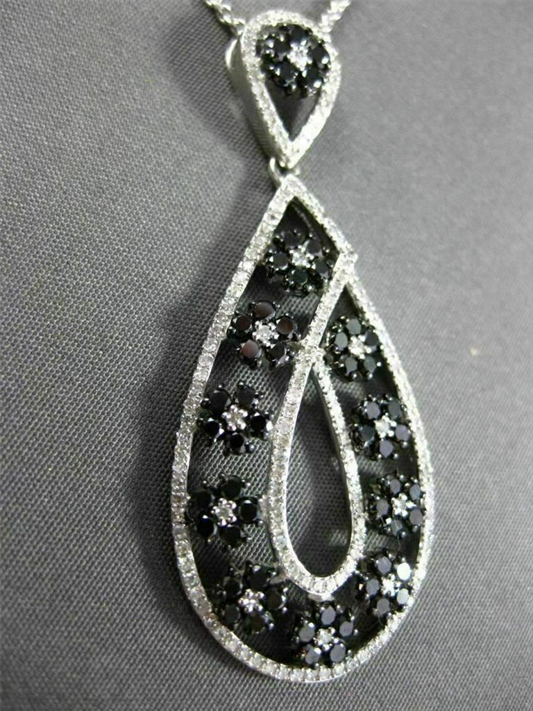 ESTATE 14KT WHITE GOLD DROP PENDANT. FLORAL DESIGN. DIAMONDS ARE F/G COLOR, VS CLARITY .67 CARATS. AAA BLACK DIAMONDS ARE 1.25 CARATS. MEASURES 47MM X 20MM WIDE. COMES ON A 14KT GOLD DIAMOND CUT 18 INCH CHAIN. SIZING CAN BE PROVIDED BY OUR MASTER JEWELER. APPRAISALS ARE AVAILABLE UPON REQUEST. COMES IN A PRESENTABLE GIFT BOX.