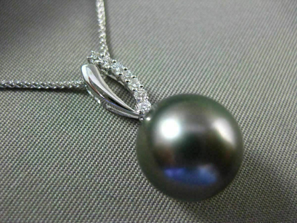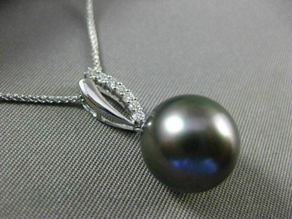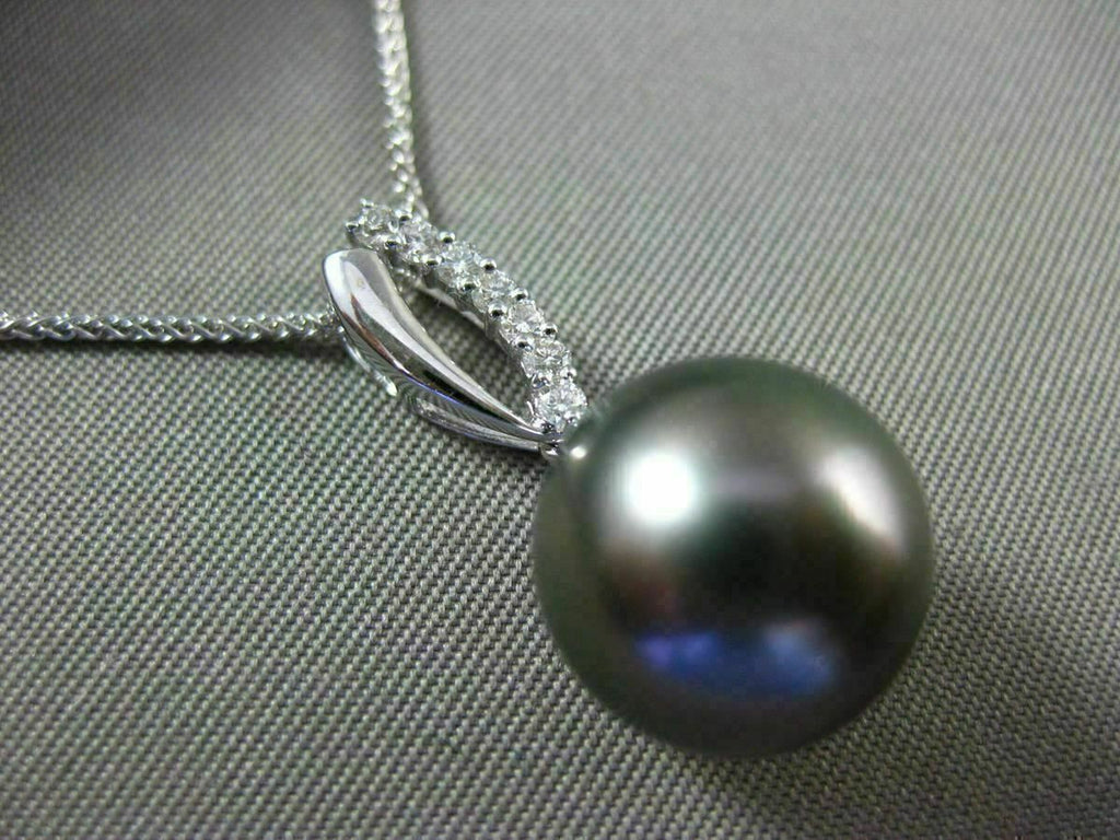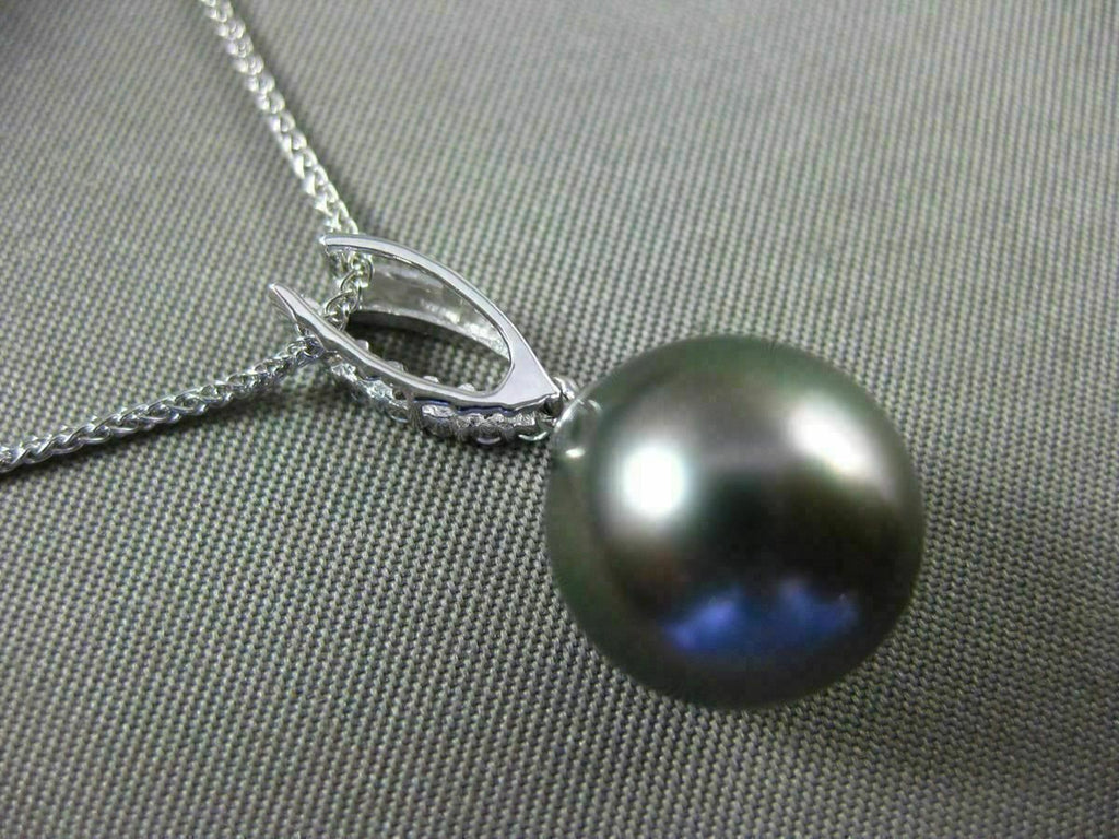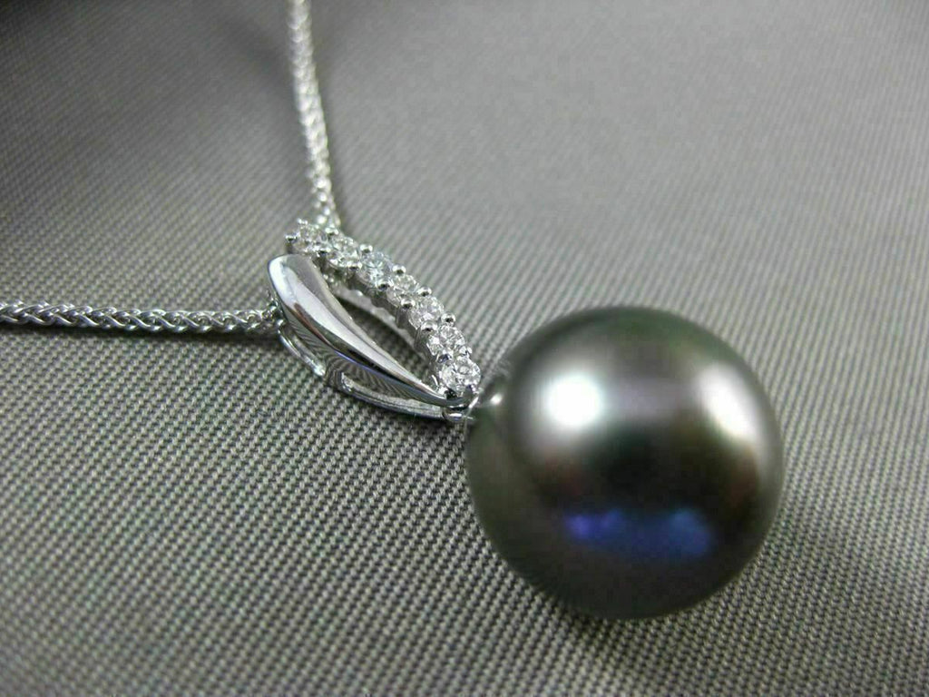 ESTATE 14KT WHITE GOLD FLOATING PENDANT. 3D CLASSIC OPEN LEAF DESIGN. DIAMONDS ARE F/G COLOR, VVS/VS CLARITY .11 CARATS. FEATURES AAA TAHITIAN PEARL (11mm). MEASURES 24mm x 11mm WIDE. COMES ON A 14KT GOLD DIAMOND CUT 16" INCH CHAIN. WRITTEN APPRAISAL AVAILABLE. COMES IN A PRESENTABLE GIFT BOX.