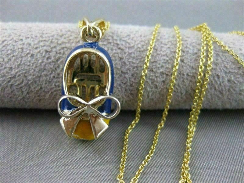 ESTATE 14K YELLOW GOLD PENDANT. CHILD SHOE DESIGN. BLUE AND YELLOW ENAMEL. FEATURES OPEN DESIGN BOTTOM. PENDANT MEASURES 23MM x 10MM. BALE IS 8MM. COMES ON A 14K GOLD DIAMOND CUT CHAIN. WRITTEN APPRAISAL AVAILABLE. COMES IN A PRESENTABLE GIFT BOX.