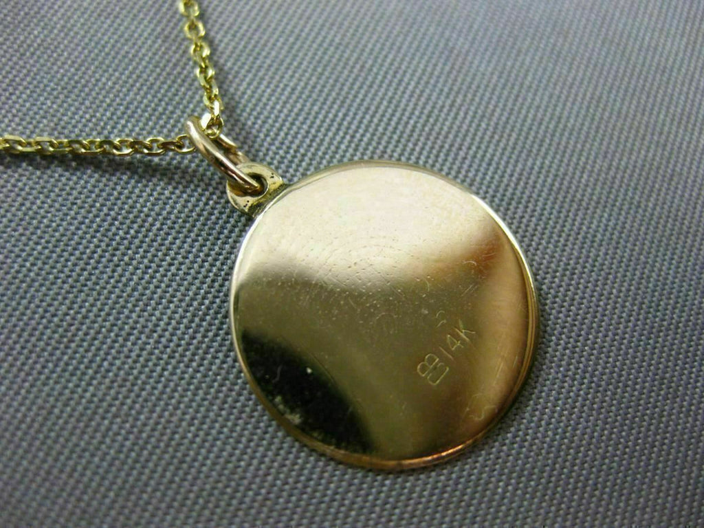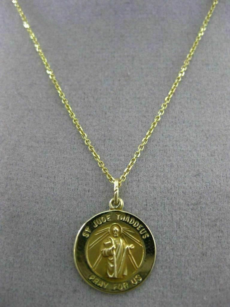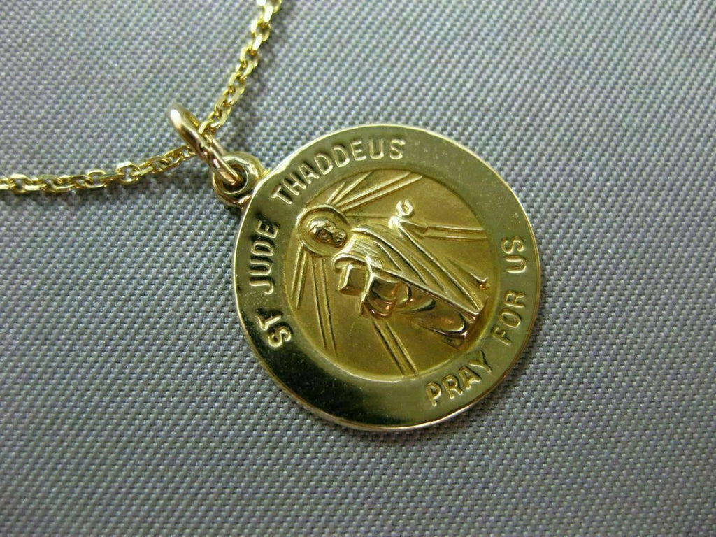 ESTATE 14KT YELLOW GOLD FLOATING PENDANT. 3D HANDCRAFTED CIRCULAR SAINT JUDE THADDEUS PRAY FOR US DESIGN. MEASURES 20mm X 15mm WIDE. COMES ON A 14KT GOLD DIAMOND CUT 16" INCH CHAIN. WRITTEN APPRAISAL AVAILABLE. COMES IN A PRESENTABLE GIFT BOX.