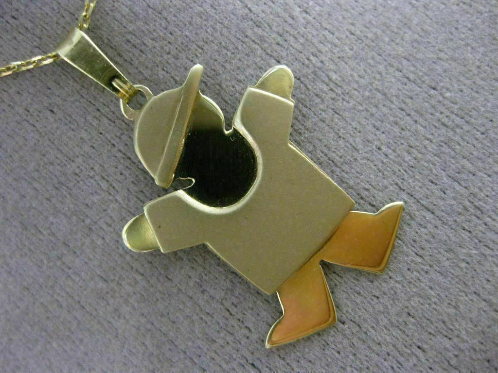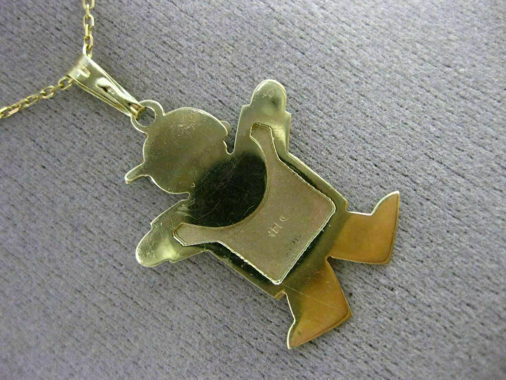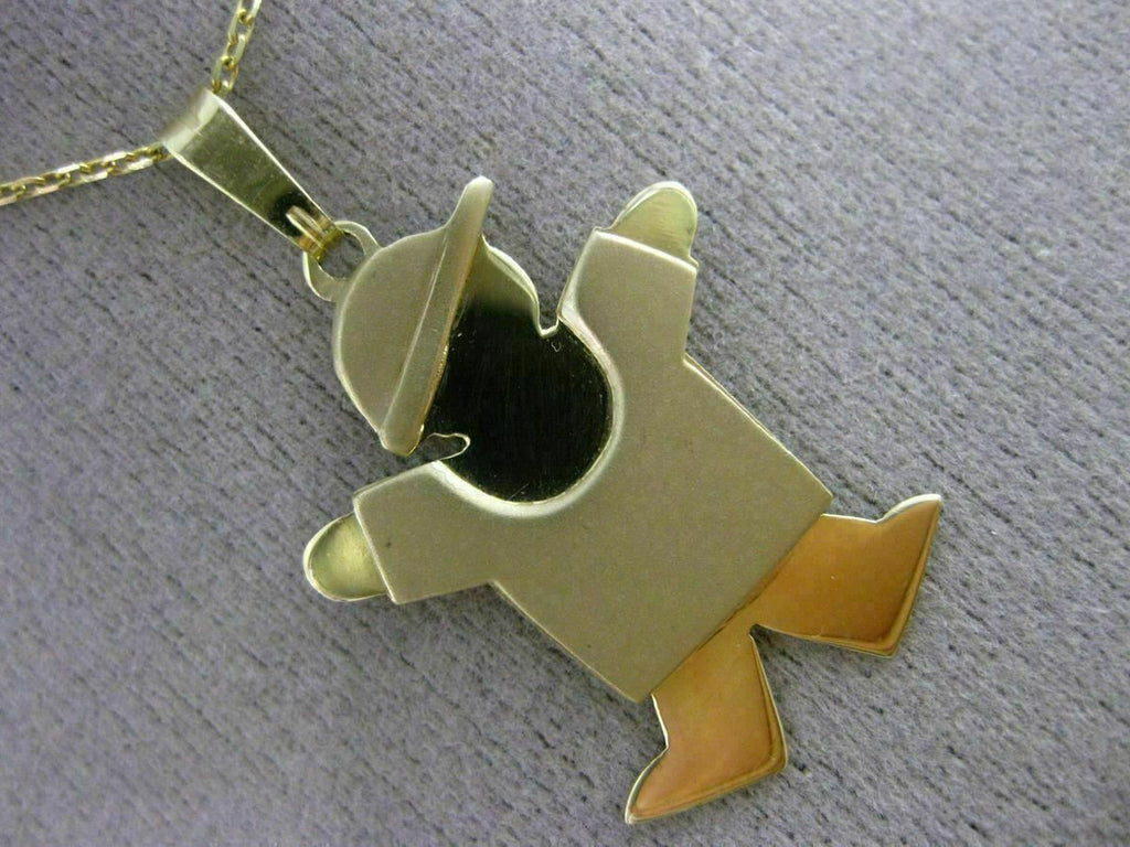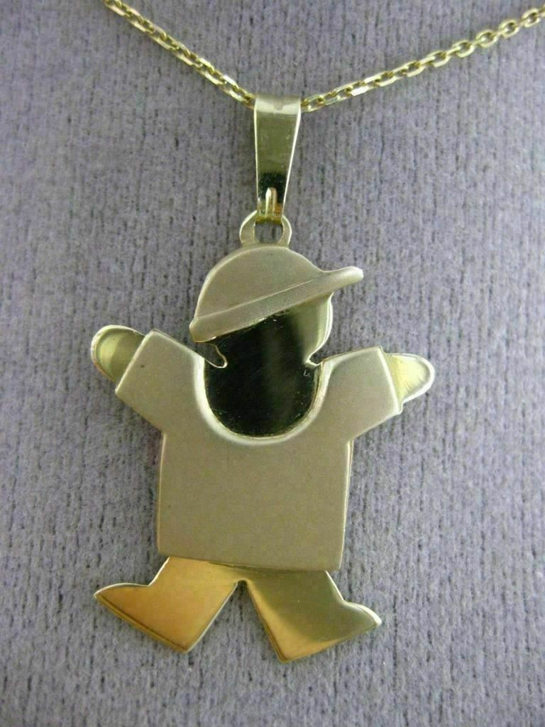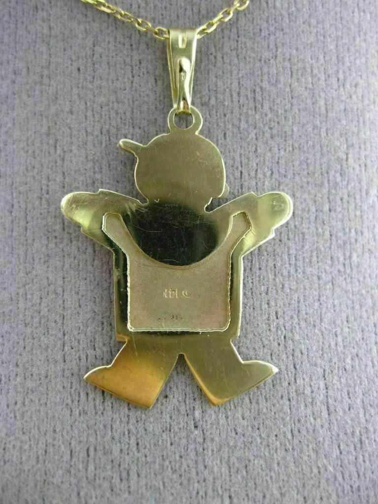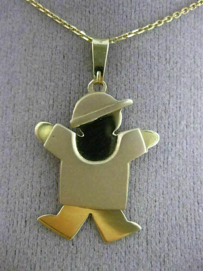 ESTATE 14KT YELLOW GOLD FLOATING PENDANT. 3D ENGRAVABLE HANDCRAFTED BABY BOY DESIGN. MEASURES 30mm X 18.5mm. COMES ON A 14KT GOLD DIAMOND CUT 16" INCH CHAIN. WRITTEN APPRAISAL AVAILABLE. COMES IN A PRESENTABLE GIFT BOX.
