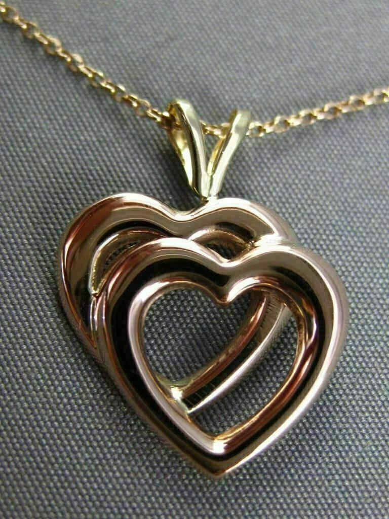 ESTATE 14KT YELLOW & ROSE GOLD FLOATING PENDANT. 3D CLASSIC OPEN HEART LOVE DESIGN. MEASURES 21mm X 16mm WIDE. COMES ON A 14KT GOLD DIAMOND CUT 16" INCH CHAIN. WRITTEN APPRAISAL AVAILABLE UPON REQUEST. COMES IN A PRESENTABLE GIFT BOX.
