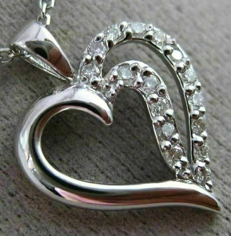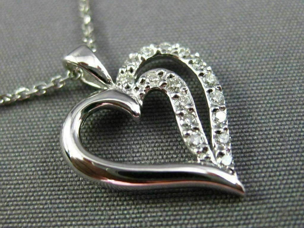 ESTATE 14KT WHITE GOLD FLOATING PENDANT. 3D DOUBLE HEART LOVE DESIGN. DIAMONDS ARE F/G COLOR, VSSI CLARITY .15 CARATS. MEASURES 18mm X 14mm WIDE. COMES ON A 14KT GOLD DIAMOND CUT 16" INCH CHAIN. WRITTEN APPRAISAL AVAILABLE. COMES IN A PRESENTABLE GIFT BOX.