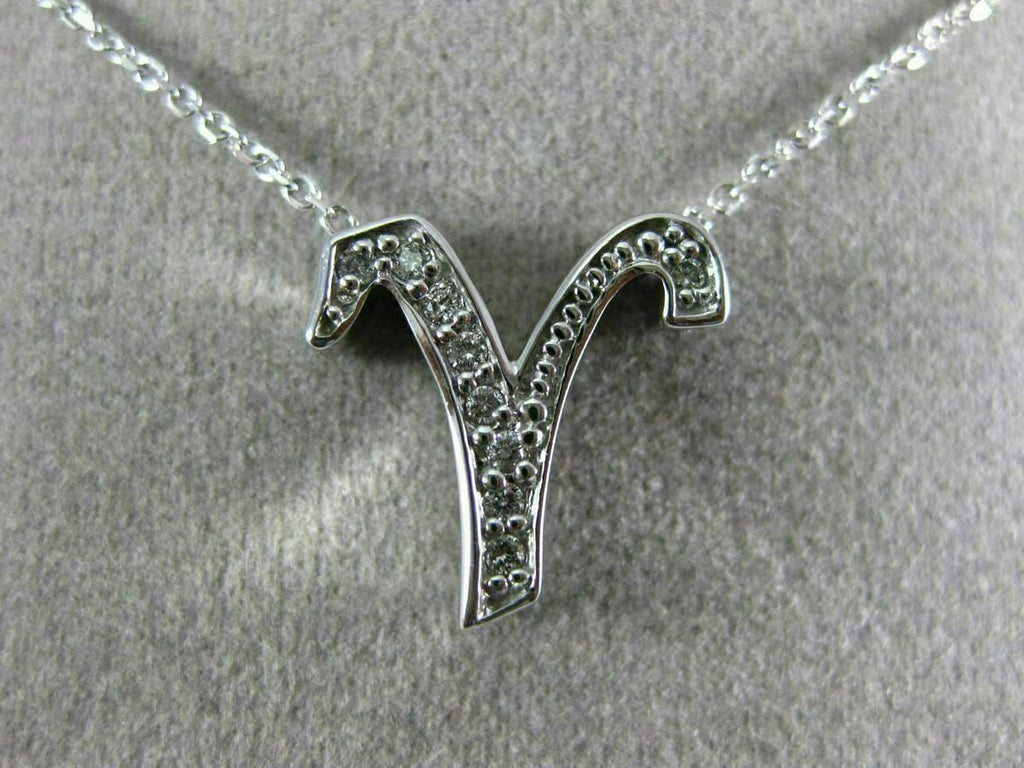 ESTATE 14KT WHITE GOLD Y INITIAL PENDANT. ZODIAC ARIES SIGN. DIAMONDS ARE G COLOR, VS CLARITY .15CT. MEASURES 13MM WIDE.COME ON A 16 INCH 14KT WHITE GOLD CHIAN. SIZING CAN BE PROVIDED BY OUR MASTER JEWELER. APPRAISALS ARE AVALIABLE UPON REQUEST. COMES IN A PRESENTABLE GIFT BOX.