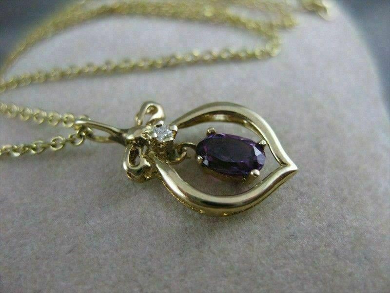 ESTATE 14KT YELLOW GOLD PENDANT. HANGING BOW DESIGN. DIAMOND IS F/G COLOR, VS CLARITY .03 CARATS. OVAL SHAPED AMETHYST IS 1.0 CARAT. DIMENSIONS ARE 21MM x 11MM. COMES ON A 14K DIAMOND CUT CHAIN. WRITTEN APPRAISAL AVAILABLE. COMES IN A PRESENTABLE GIFT BOX.