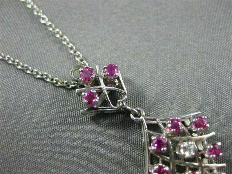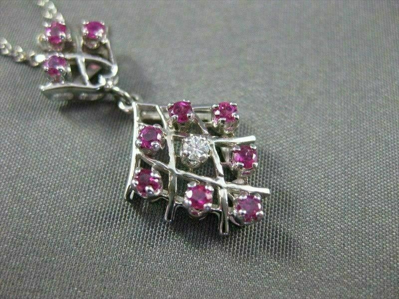 ESTATE 14K WHITE GOLD PENDANT. HANGING DANGLE DESIGN. DIAMONDS ARE F/G COLOR, VS CLARITY, .02 CARATS. AAA RUBIES ARE .22 CARATS. MEASURES 30MM x 14MM. COMES ON A 16" 14K WHITE GOLD DOUBLE CHAIN. WRITTEN APPRAISAL AVAILABLE. COMES IN A GIFT BOX.