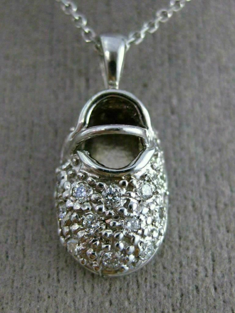 ESTATE 14KT WHITE GOLD FLOATING PENDANT. 3D HANDCRAFTED BABY GIRL SHOE DESIGN. DIAMONDS ARE F/G COLOR, VVS/VS CLARITY .25 CARATS. MEASURES 20mm X 9mm. COMES ON A 14KT GOLD DIAMOND CUT 16" INCH CHAIN. WRITTEN APPRAISAL AVAILABLE. COMES IN A PRESENTABLE GIFT BOX.