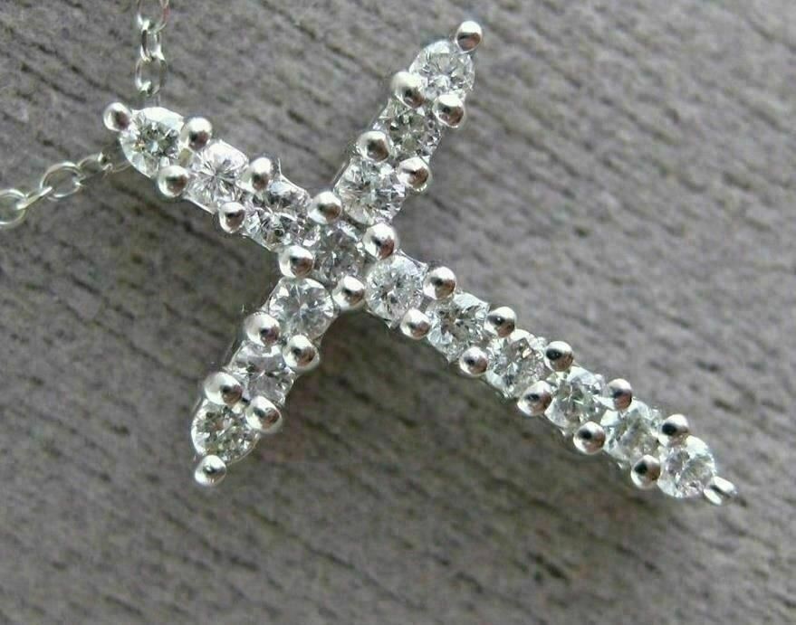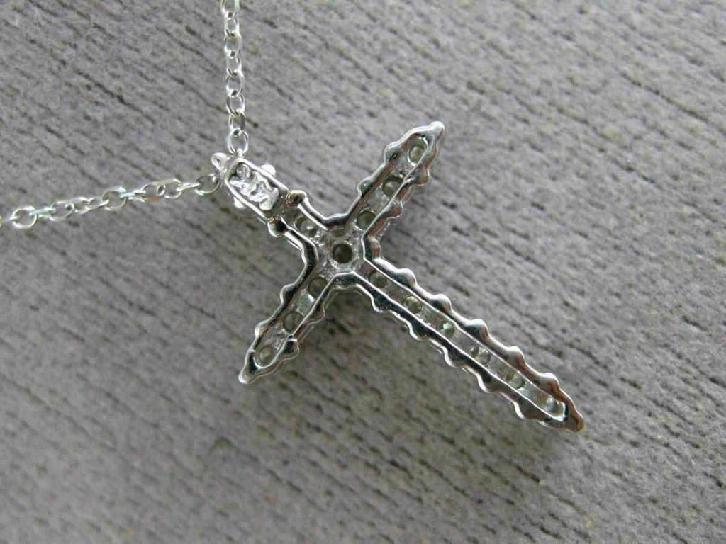 ESTATE 14KT WHITE GOLD CLASSIC FLOATING PENDANT. 3D CROSS SHARE PRONG DESIGN. DIAMONDS ARE G/H COLOR, VSSI CLARITY .35 CARATS. MEASURES 17mm X 12mm. COMES ON A 14KT GOLD DIAMOND CUT 16" INCH CHAIN. WRITTEN APPRAISAL AVAILABLE. COMES IN A PRESENTABLE GIFT BOX.