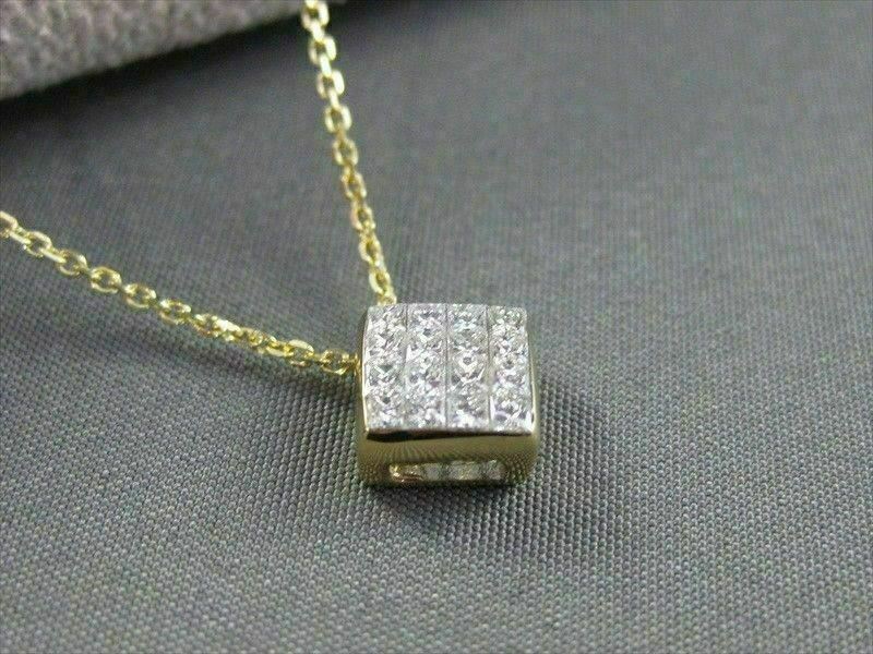 ESTATE 14K YELLOW GOLD PENDANT. INVISIBLE PRINCESS CUT DESIGN. DIAMONDS ARE F/G COLOR, VVS CLARITY, 0.39 CARAT. MEASURES 7MM WIDE. SET ON A 18" INCHES CHAIN. WRITTEN APPRAISAL AVAILABLE. COMES IN A GIFT BOX