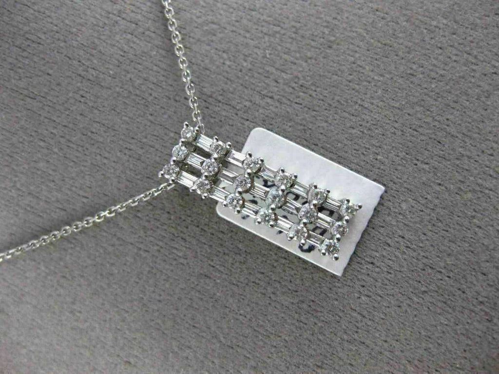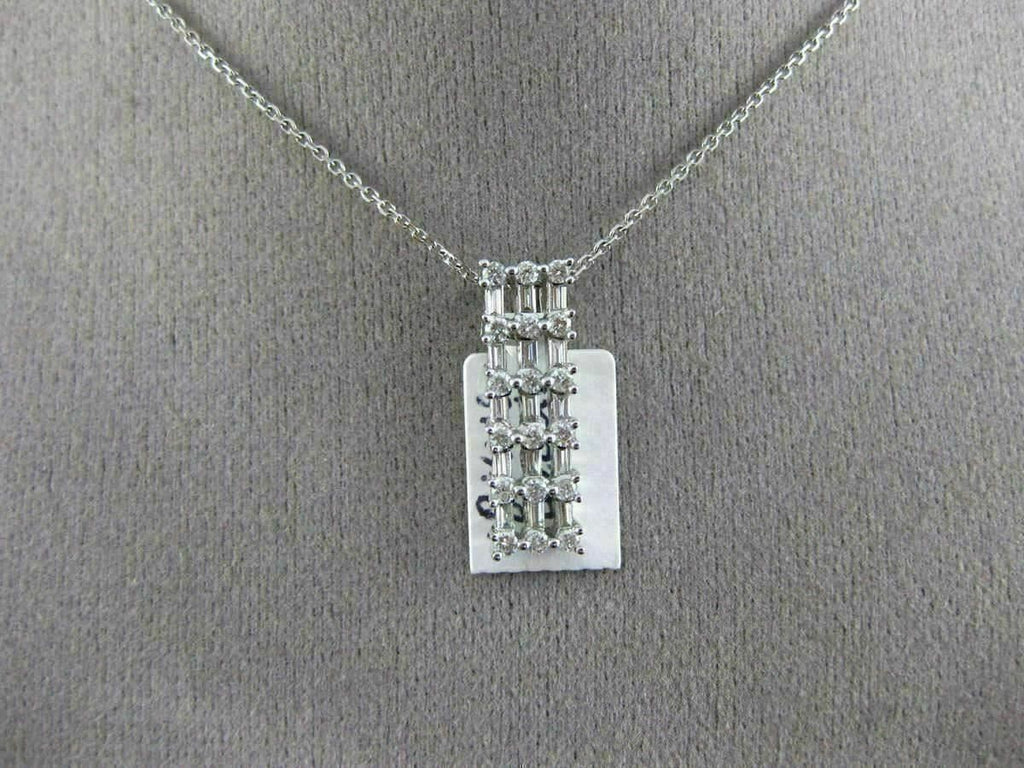 ESTATE 18KT WHITE GOLD FLOATING PENDANT. 3D 3 ROW RECTANGULAR ELONGATED DESIGN. ROUND & BAGUETTE DIAMONDS ARE G/H COLOR, VSSI CLARITY .42 CARATS. MEASURES 20mm X 5mm. COMES ON A 14KT GOLD DIAMOND CUT 16" INCH CHAIN. CAN BE SIZED BY OUR MASTER JEWELER. WRITTEN APPRAISAL AVAILABLE. COMES IN A PRESENTABLE GIFT BOX.