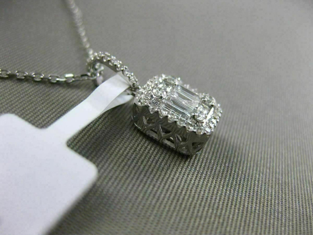 ESTATE 18KT WHITE GOLD FLOATING PENDANT. 3D RECTANGULAR HALO DESIGN. ROUND & BAGUETTE CUT DIAMONDS ARE F/G COLOR, VVS/VS CLARITY .50 CARATS. MEASURES 18mm X 8mm WIDE. COMES ON A 14KT GOLD DIAMOND CUT 16" INCH CHAIN. WRITTEN APPRAISAL AVAILABLE UPON REQUEST. COMES IN A PRESENTABLE GIFT BOX.