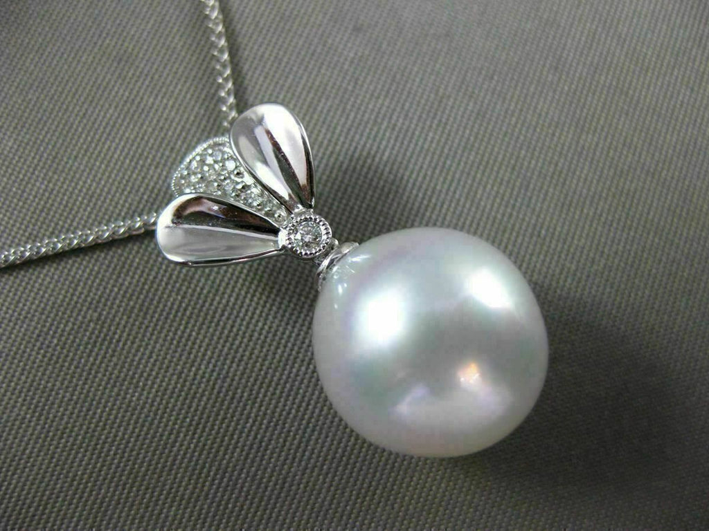 ESTATE LARGE 14KT WHITE GOLD FLOATING PENDANT. 3D FLOWER ETOILE FILIGREE MILGRAIN DESIGN. DIAMONDS ARE F/G COLOR, VVS/VS CLARITY .06 CARATS. FEATURES AAA SOUTH SEA PEARL (12.5mm). MEASURES 20mm X 11mm WIDE. COMES ON A 14KT GOLD DIAMOND CUT 16" INCH CHAIN. WRITTEN APPRAISAL AVAILABLE. COMES IN A PRESENTABLE GIFT BOX.