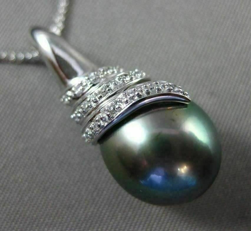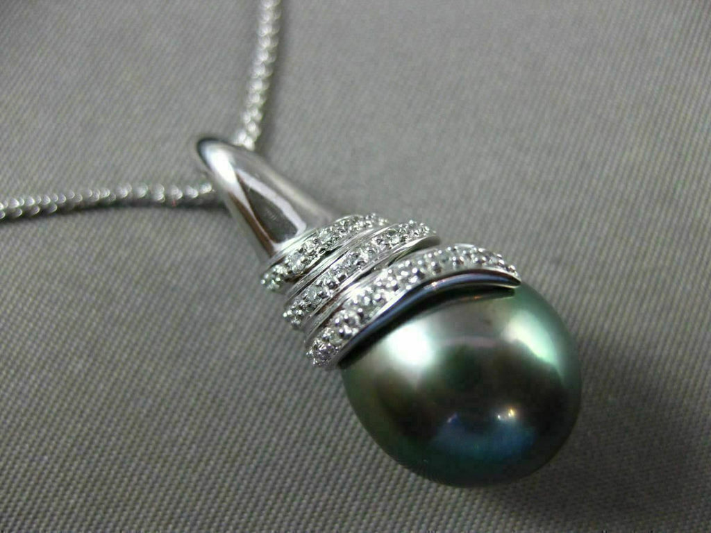ESTATE LARGE 18KT WHITE GOLD FLOATING PENDANT. 3D SWIRL DESIGN. DIAMONDS ARE F/G COLOR, VVS/VS CLARITY .07 CARATS. FEATURES AAA TAHITIAN PEARL (11mm). MEASURES 27mm x 11mm WIDE. COMES ON A 14KT GOLD DIAMOND CUT 16" INCH CHAIN. WRITTEN APPRAISAL AVAILABLE. COMES IN A PRESENTABLE GIFT BOX.
