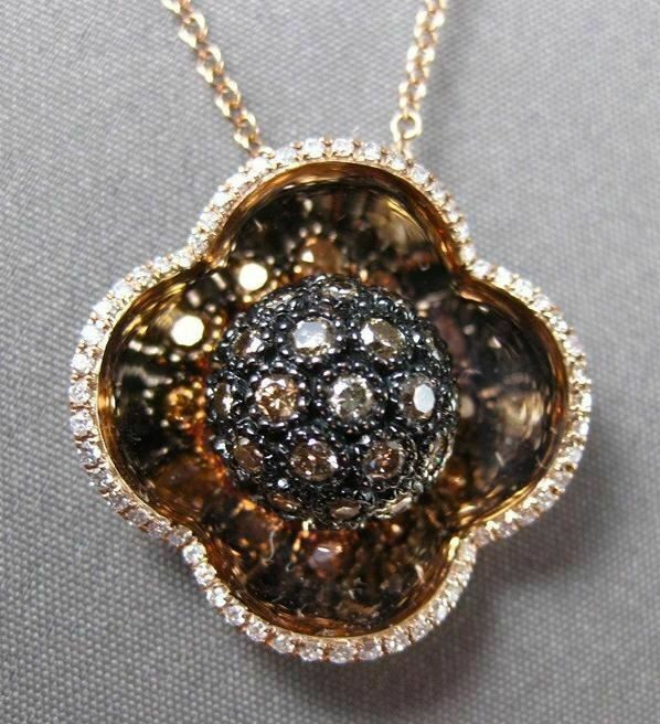 ESTATE 14KT BALCK AND ROSE GOLD PENDANT. 4 LEAF CLOVER FLOATING DESIGN. FANCY YELLOW AND BLACK DIAMONDS ARE 1.25 CARATS. MEASURES 21MM x 21MM. COMES ON A 14KT DIAMOND CUT 16 INCHES CHAIN . WRITTEN APPRAISAL AVAILABLE. COMES IN A PRESENTABLE GIFT BOX.
