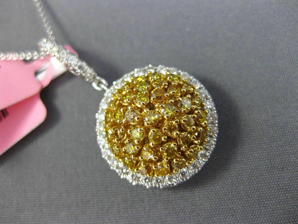 ESTATE LARGE 18KT WHITE AND¬€ YELLOW GOLD FLOATING PENDANT. 3D ROUND CLUSTER CLASSIC¬€ DESIGN. DIAMONDS ARE F/G COLOR, VSSI CLARITY .45 CARATS. FANCY YELLOW DIAMONDS ARE¬€ .82 CARATS. MEASURES 30mm X 17mm. COMES ON A 14KT GOLD DIAMOND CUT 16" INCH CHAIN. WRITTEN APPRAISAL AVAILABLE. COMES IN A PRESENTABLE GIFT BOX.