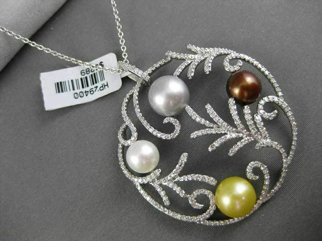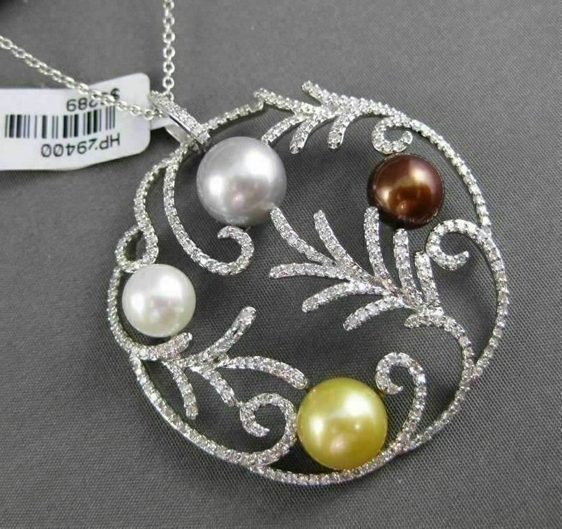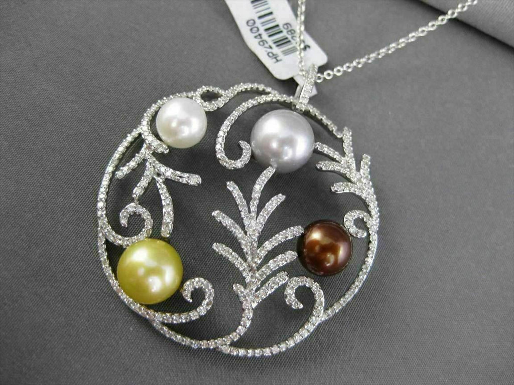 ESTATE LARGE 18KT WHITE GOLD FLOATING PENDANT. DIAMONDS ARE F/G COLOR, VS CLARITY 1.30 CARATS. FEATURES 10MM AAA MULTI COLOR PEARLS. MEASURES 43MM WIDE. COMES ON 14KT GOLD 16 INCH DIAMOND CUT CHAIN. WRITTEN APPRAISAL AVAILABLE. COMES IN A PRESENTABLE GIFT BOX.