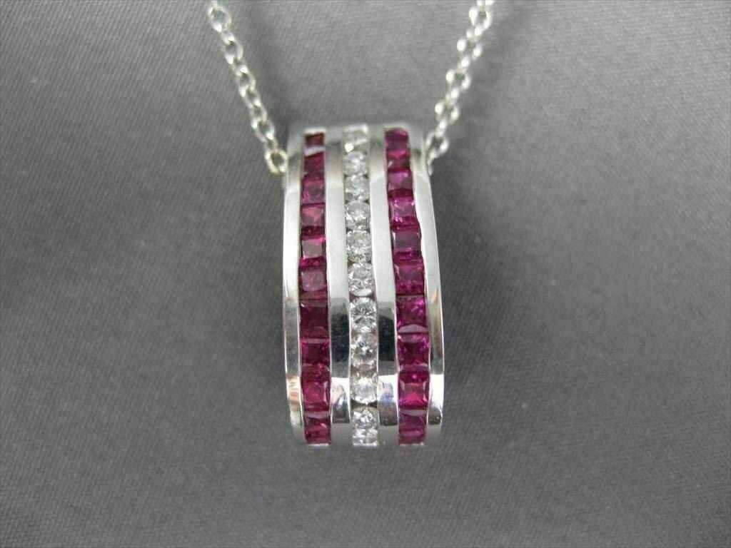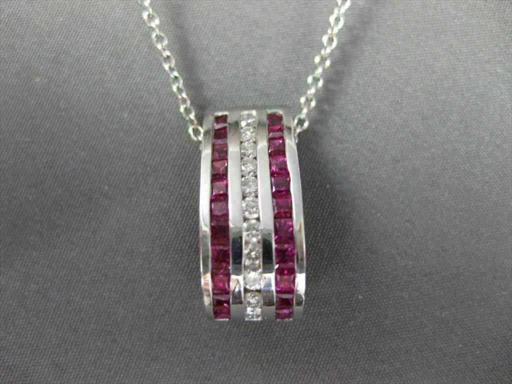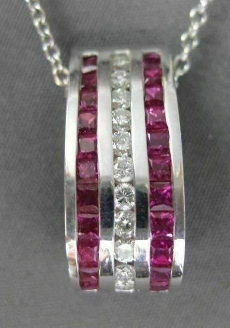 ESTATE LARGE 14KT WHITE GOLD PENDANT. SLIDE DESIGN. AAA RUBIES ARE 1.22 CARATS. DIAMONDS ARE F/G COLOR, VS CLARITY .35 CARATS. MEASURES 20X10MM WIDE. COMES ON A 16 INCH 14KT DIAMOND CUT CHAIN. SIZING CAN BE PROVIDED BY OUR MASTER JEWELER. APPRAISALS ARE AVAILABLE UPON REQUEST. COMES IN A PRESENTABLE GIFT BOX.