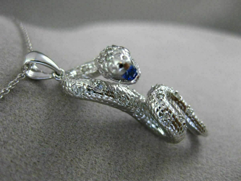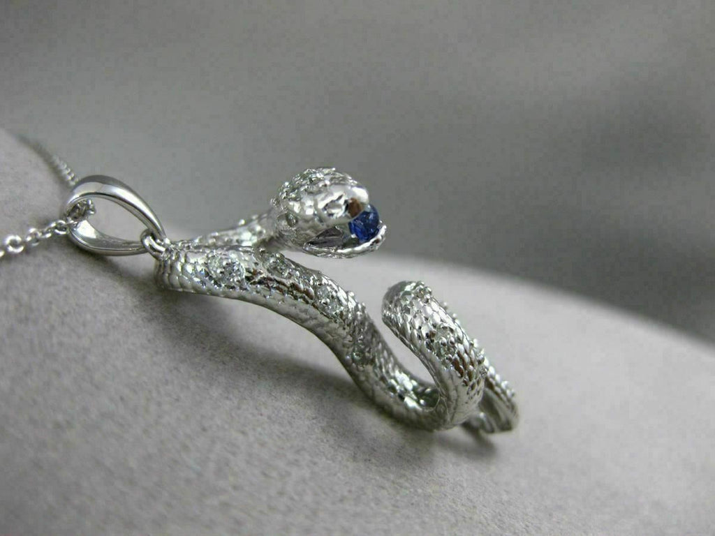 ESTATE LARGE 14KT WHITE GOLD FUN FLOATING PENDANT. 3D SNAKE DESIGN. DIAMONDS ARE F/G COLOR, VSSI CLARITY .21 CARATS. AAA EXTRA FACET SAPPHIRE IS .10 CARATS. MEASURES 36mm x 4mm WIDE. COMES ON A 14KT GOLD DIAMOND CUT 16" INCH CHAIN. WRITTEN APPRAISAL AVAILABLE. COMES IN A PRESENTABLE GIFT BOX.