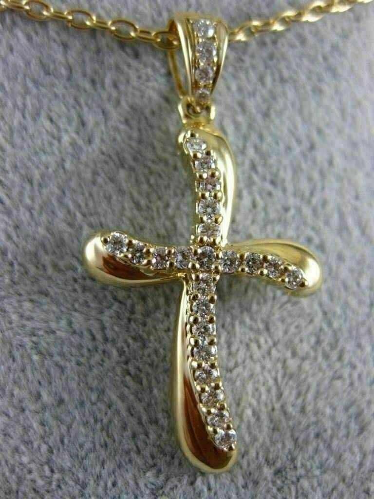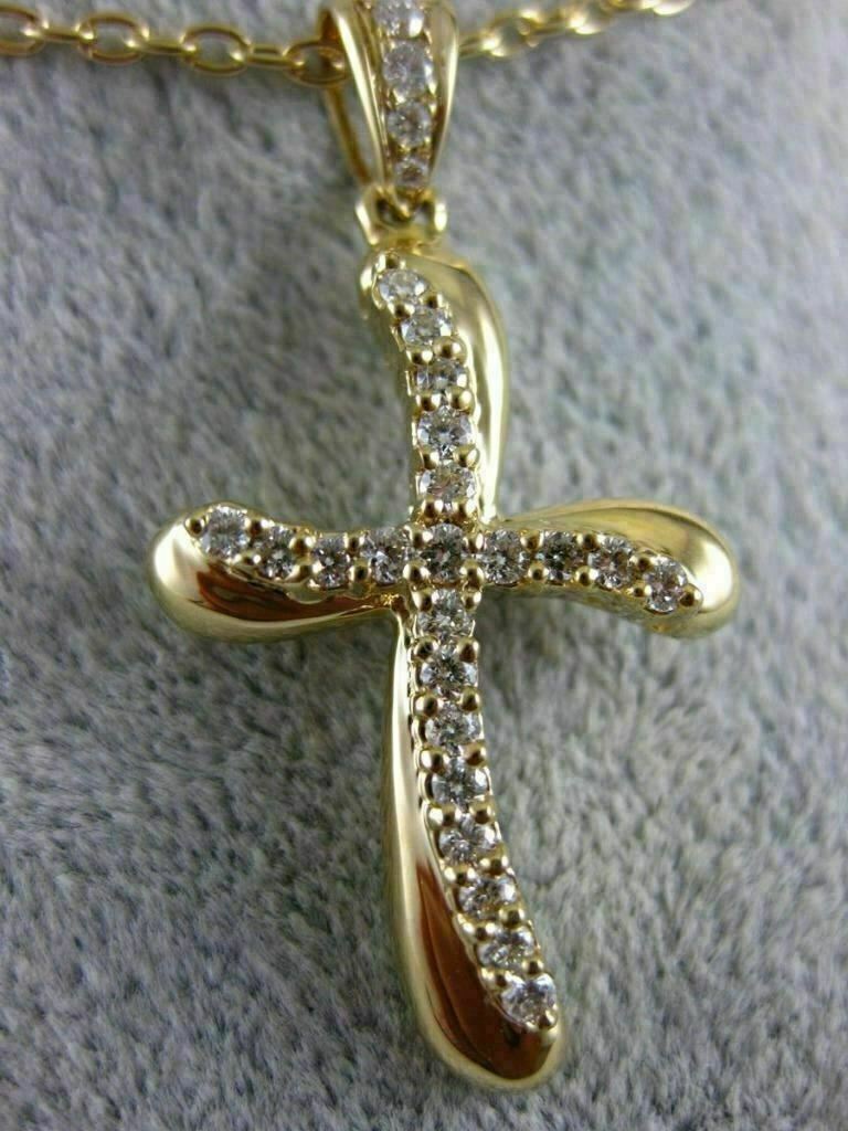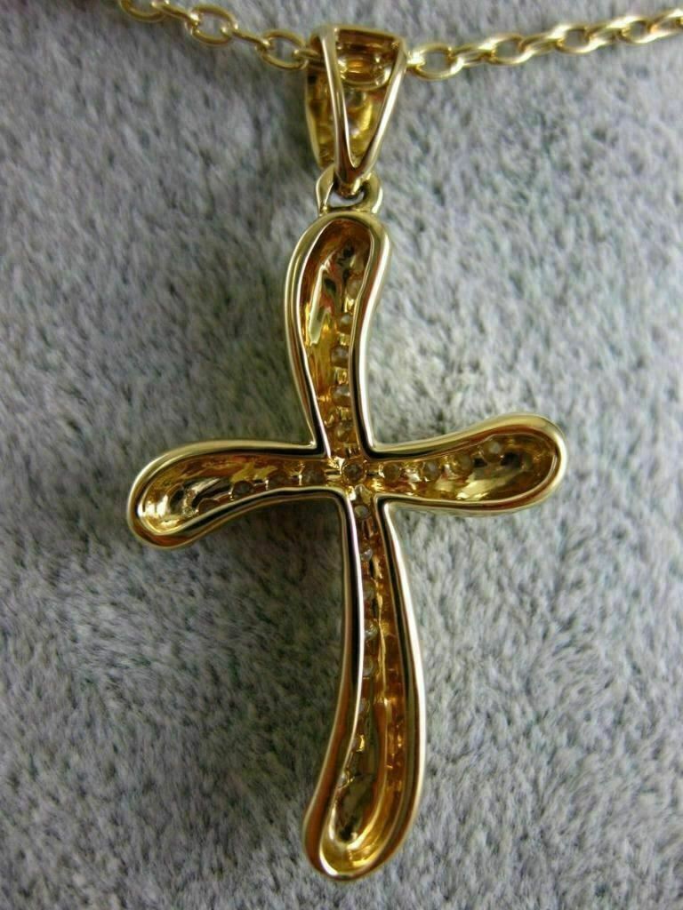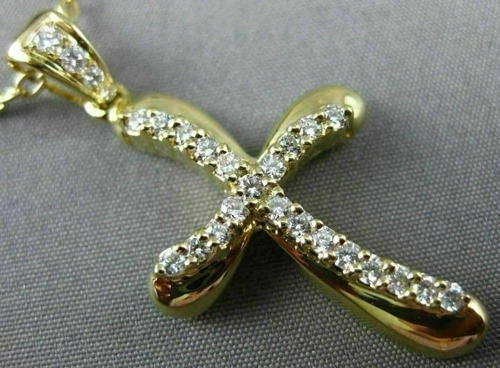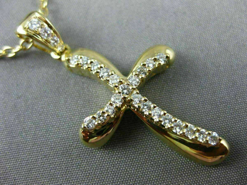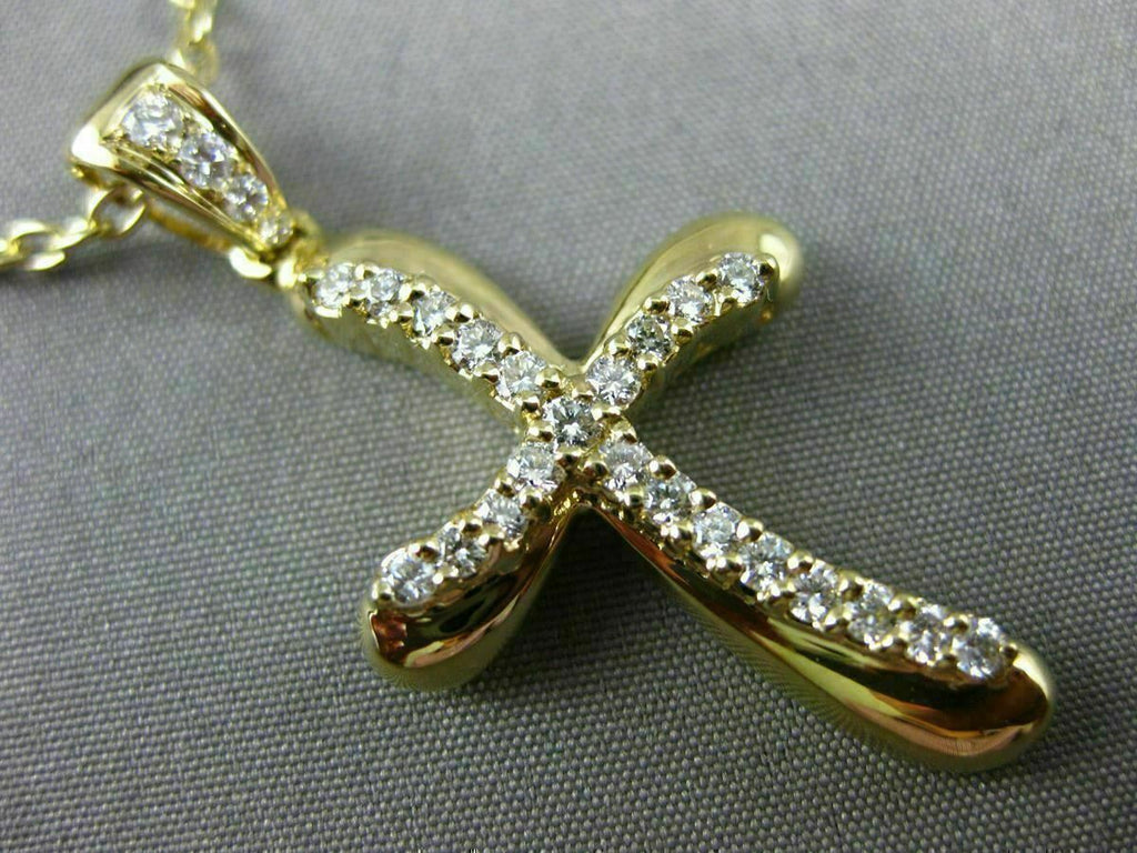 ESTATE LARGE 18KT YELLOW GOLD FLOATING PENDANT. 3D WAVE SWIRL CROSS DESIGN. DIAMONDS ARE F/G COLOR, VSSI CLARITY .41 CARATS. MEASURES 36mm X 19mm. COMES ON A 14KT GOLD DIAMOND CUT 18" INCH CHAIN. WRITTEN APPRAISAL AVAILABLE. COMES IN A PRESENTABLE GIFT BOX.